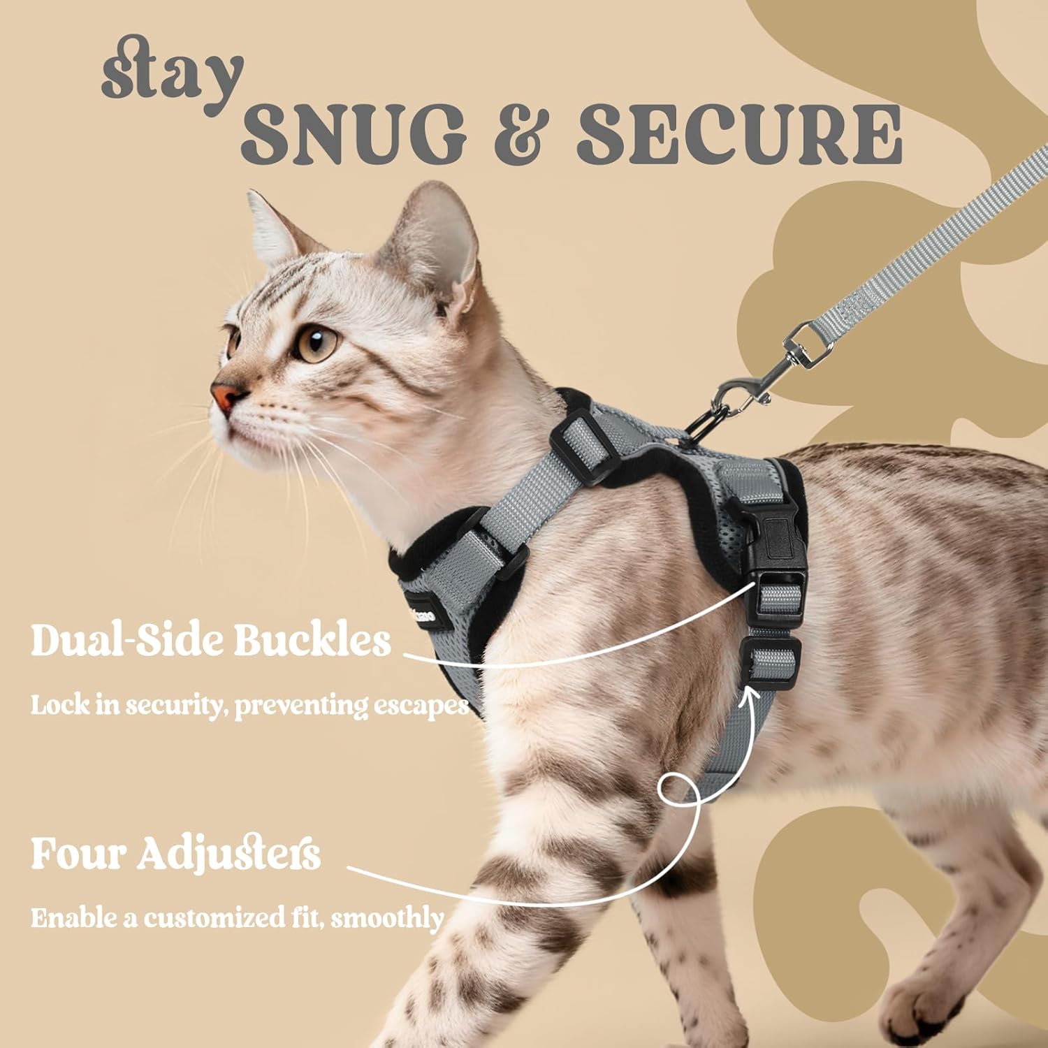 • Светлоотразителни ленти за по-голяма безопасност. Нагръдникът за котки, предпазващ от бягство, разполага с 2 странични катарами за сигурно закопчаване. С 4-те регулируеми презрамки можете бързо да регулирате размера на нагръдника, за да предотвратите изплъзване или изгубване на котката. Светлоотразителните ленти правят котката ви видима при условия на слаба светлина. Подобрява безопасността при разходки през нощта.