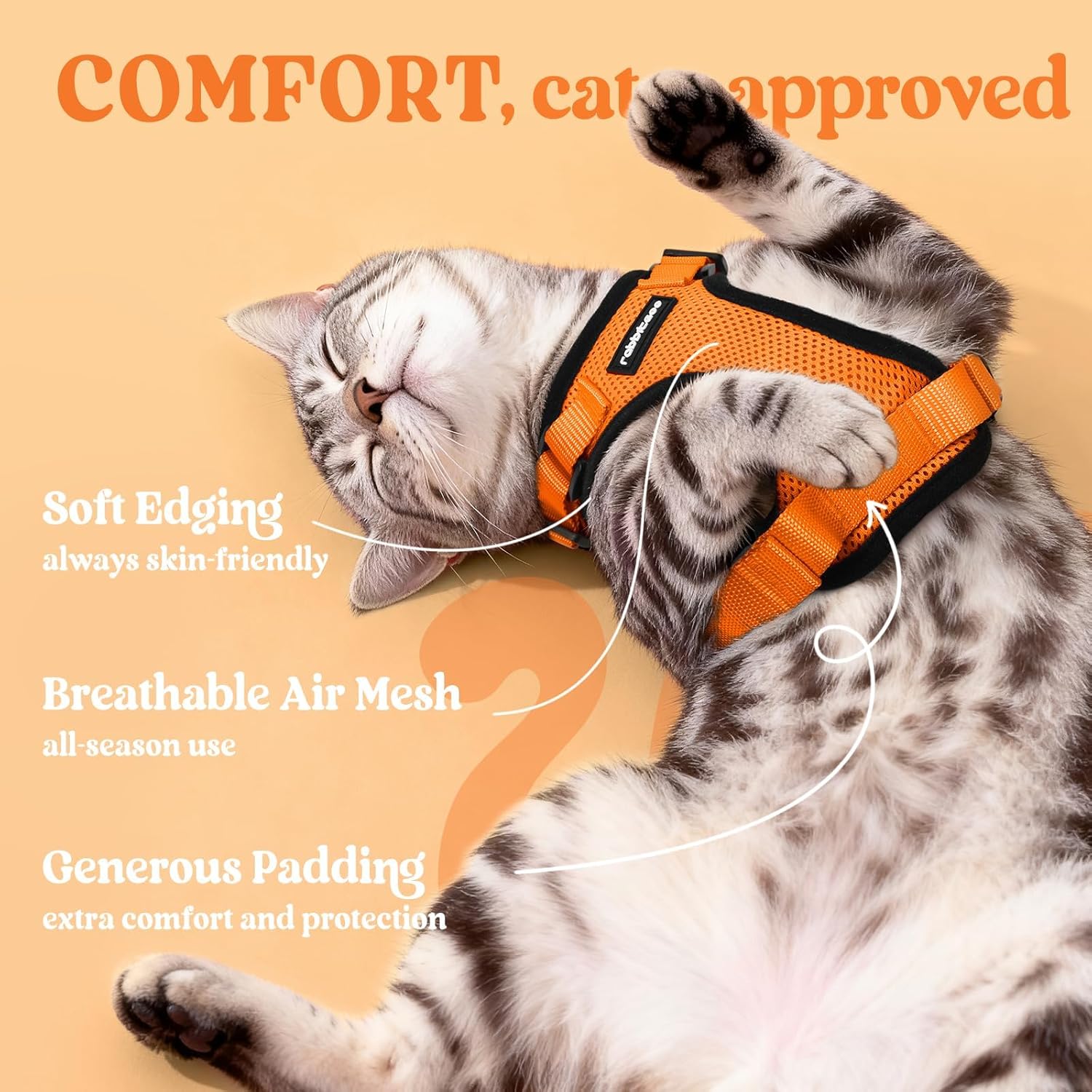 • По-добър контрол против дърпане: Прикрепете котешката каишка към металната щипка за каишка на гърба ѝ с дългата, издръжлива найлонова каишка, за да може котката ви да изследва природата безопасно и удобно. Дизайнът на котешката жилетка разпределя налягането на каишката равномерно по гърдите и рамото, за да предотврати задавяне или напрежение във врата, което осигурява много по-голям комфорт и безопасност.
