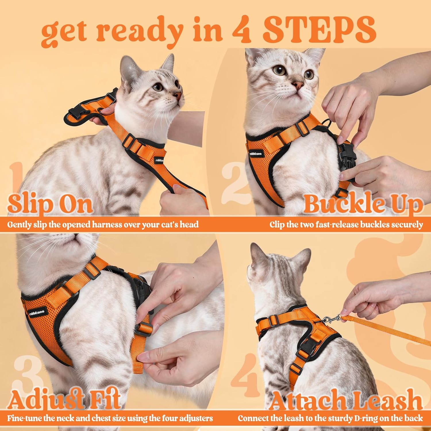 Нагръдник за котки rabbitgoo с каишка, мек нагръдник за котки, нагръдник, нагръдник за котки, защитен от бягство, регулируем, оранжев M