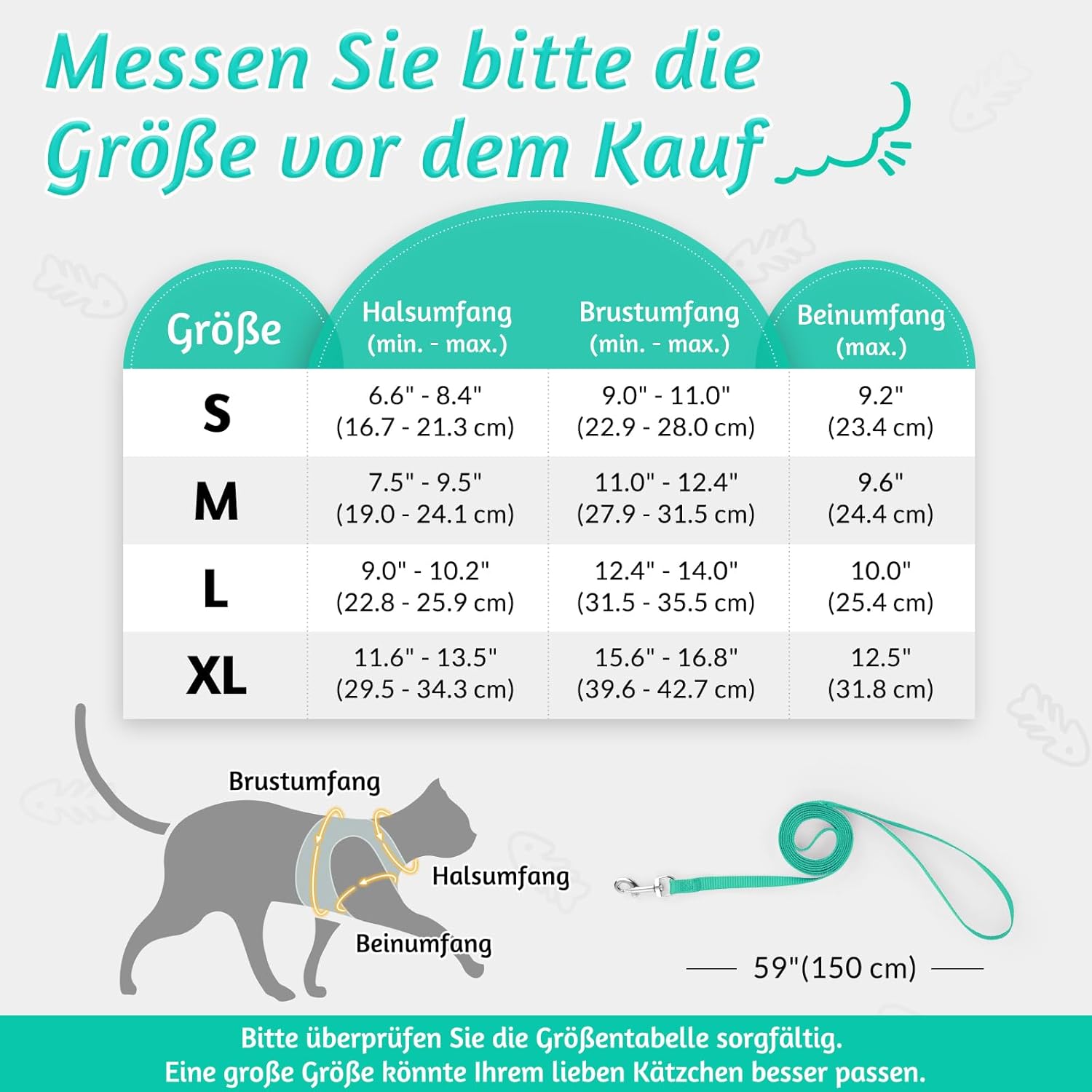 ПАСВА ПЕРФЕКТНО ЗА ВРАТА 17-21 СМ ГЪРДЕН КРЪГ 23-28 СМ Моля, измерете точно котката си и внимателно изберете нагръдник според таблицата с размери. За по-добро прилягане на вашето очарователно котенце се препоръчва да изберете по-голям размер. Комплектът включва: 1 x нагръдник за котки и 1 x найлонова каишка (149,9 см). Създаден за комфорт и функционалност, дизайнът на жилетката прави този нагръдник лесен за поставяне и сваляне. А регулируемата каишка създава перфектно прилягане за вашата котка с известно пространство за растеж. (Съвети: моля, дайте на котката си известно време да се запознае с този нагръдник за първи път)