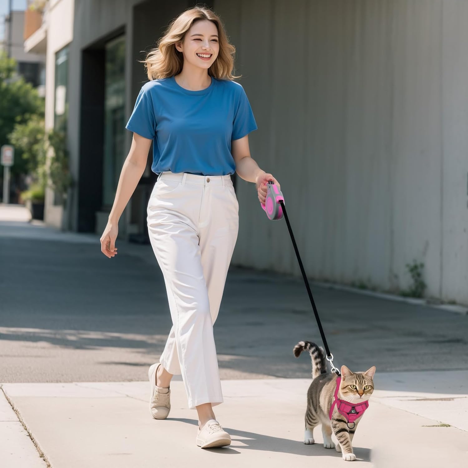Нагръдник за котки с каишка, Защита от бягство, Автоматично прибиращ се нагръдник за котки и нагръдник за котки, Комплект регулируем нагръдник за котки с каишка, Нагръдник за котки, Кучета (Розов, M)