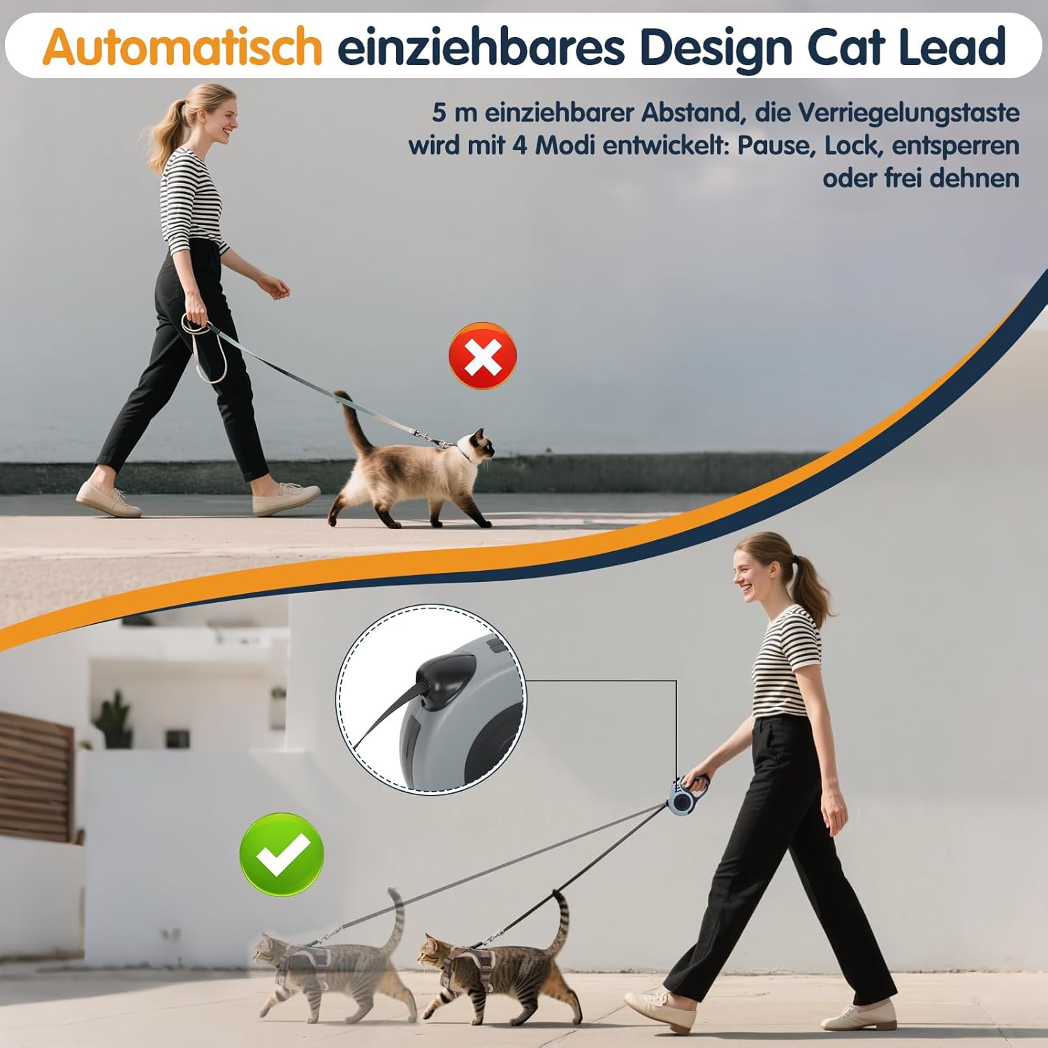 • Прибиращ се дизайн: поводът за котка има прибиращ се дизайн и ергономична, неплъзгаща се дръжка за лесно и сигурно захващане. Заключващият бутон е проектиран с 4 режима, така че можете да го поставите на пауза, заключите, отключите или разтегнете. Прибиращата се каишка с дължина 5 м позволява на вашия домашен любимец да се разхожда удобно, без да се притеснявате, че ще нарани ръката ви.