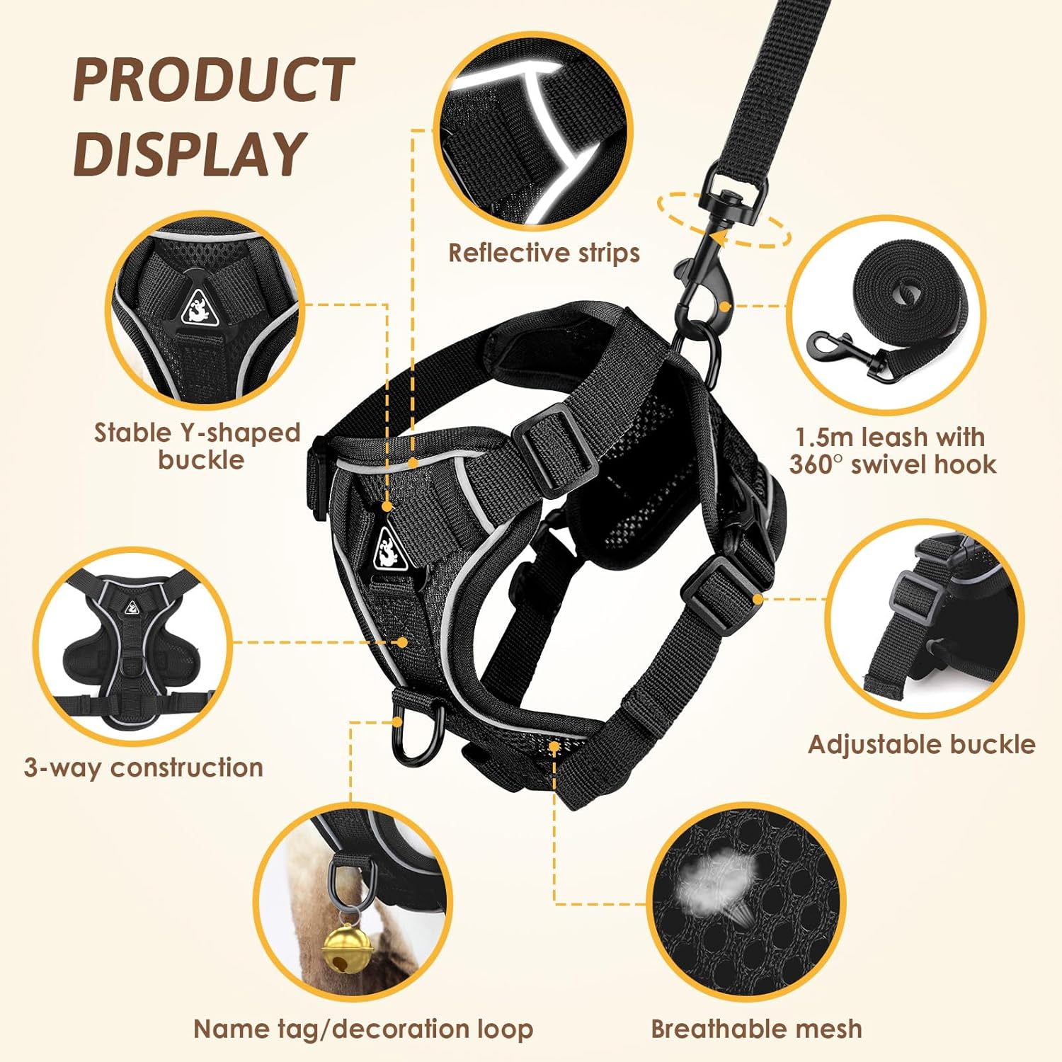 • Дишащ мрежест материал: нашият котешки нагръдник е изработен от мек мрежест материал, който се адаптира към тялото на домашния любимец. Дишащата мрежа с големи пори осигурява по-добра дишаемост. Поводът за котки с нагръдник тип жилетка може равномерно да разпредели натиска на презрамките върху гърдите и раменете, за да предотврати задушаване или пренапрежение и да гарантира, че вашата котка/куче се чувства комфортно, без да уврежда козината.