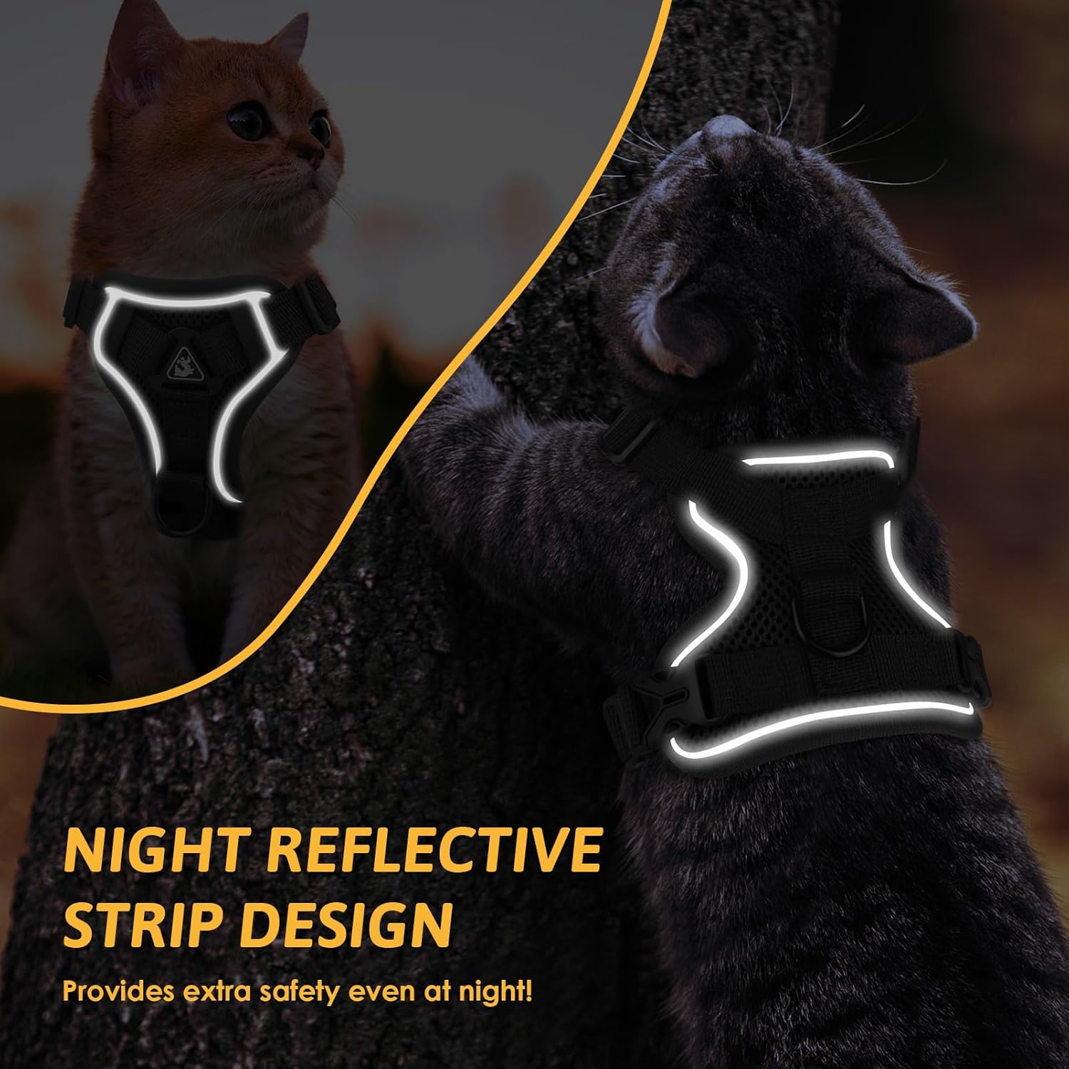 • Светлоотразителен дизайн: дизайнът на котешката каишка с отразяваща лента по целия периметър осигурява безопасността и видимостта на котенцата и техните стопани рано сутрин или късно през нощта. Дизайнът с 360-градусов светлоотразителен дизайн прави котките по-привлекателни при условия на слаба светлина и по-безопасни през нощта. Когато вашият домашен любимец носи тази каишка за котки със светлоотразителен дизайн, можете да я видите в тъмното с един поглед.