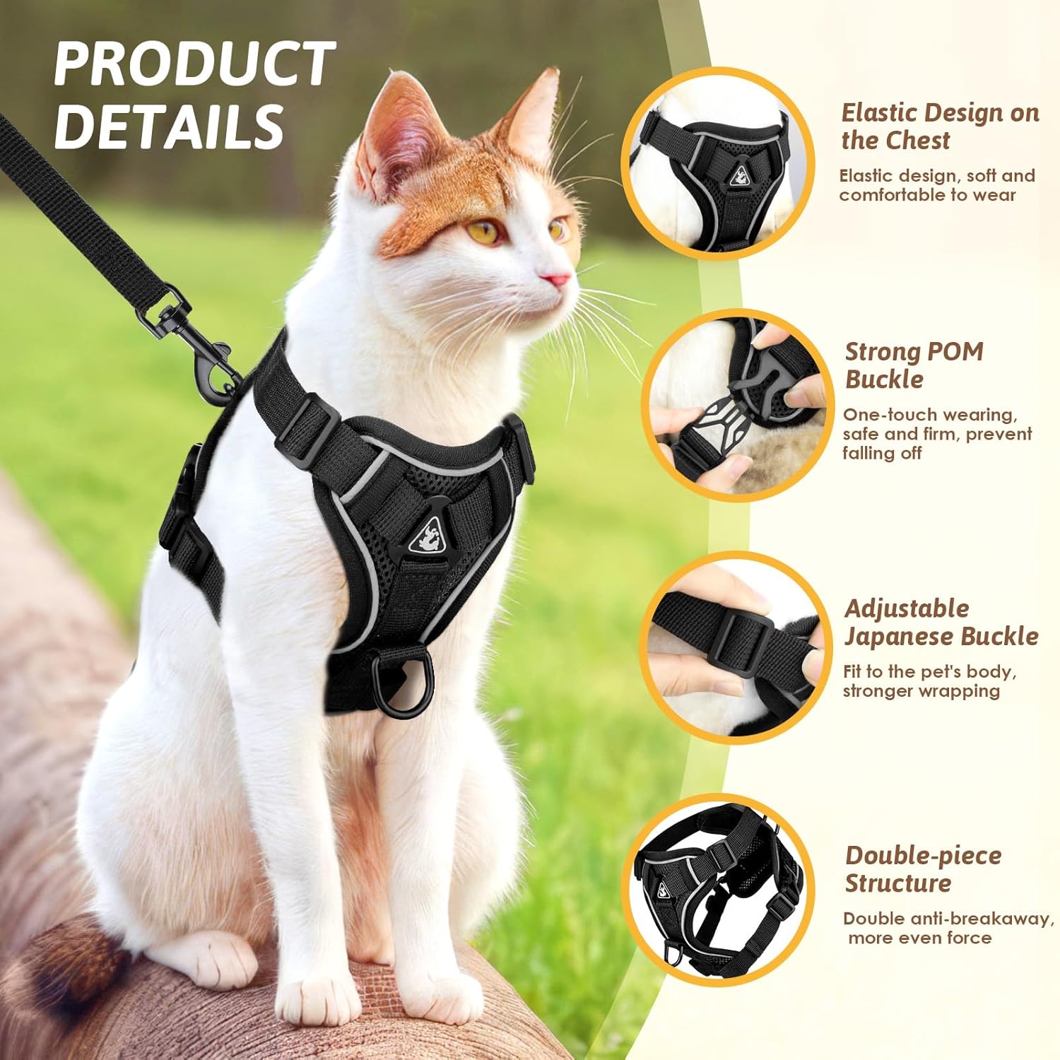 • Безопасност и предотвратяване на загуба: котешката нагръдка с каишка, предпазваща от бягство, с колан има D-образен халка за окачване на гърдите, която може да се използва за окачване на етикети с имена, картички против загуба и нощни лампи. D-образният дизайн на халката на гърба на котешката нагръдка е по-стабилен и предлага двойна защита в комбинация с двукомпонентна конструкция, за да се предотврати бягството и загубата на домашните любимци.