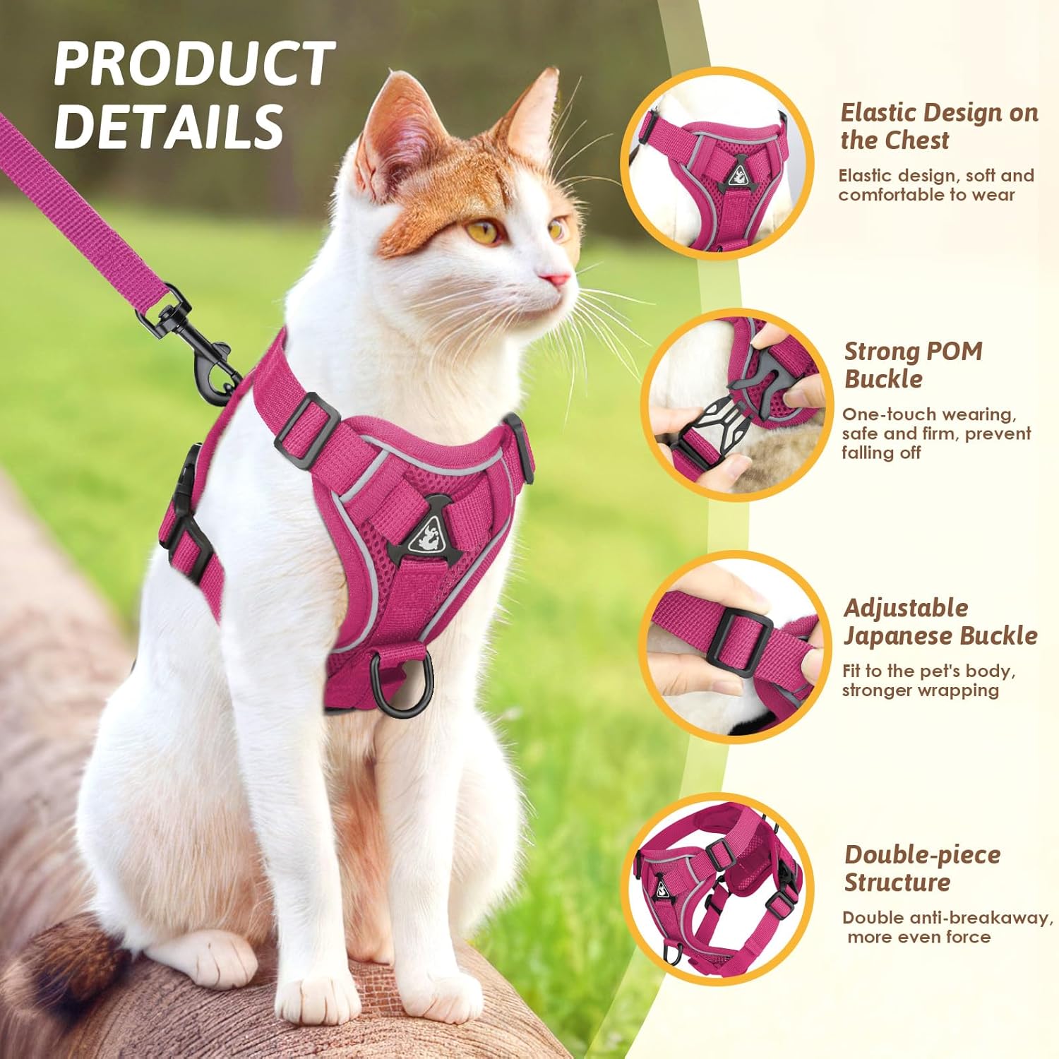 Нагръдник за котки с каишка, Защита от бягство, Каишка за котки с нагръдник за котки, Комплект регулируеми нагръдници за котки, Нагръдник за котки, Мек нагръдник за котки със светлоотразителни ленти (Розовочервен-M)