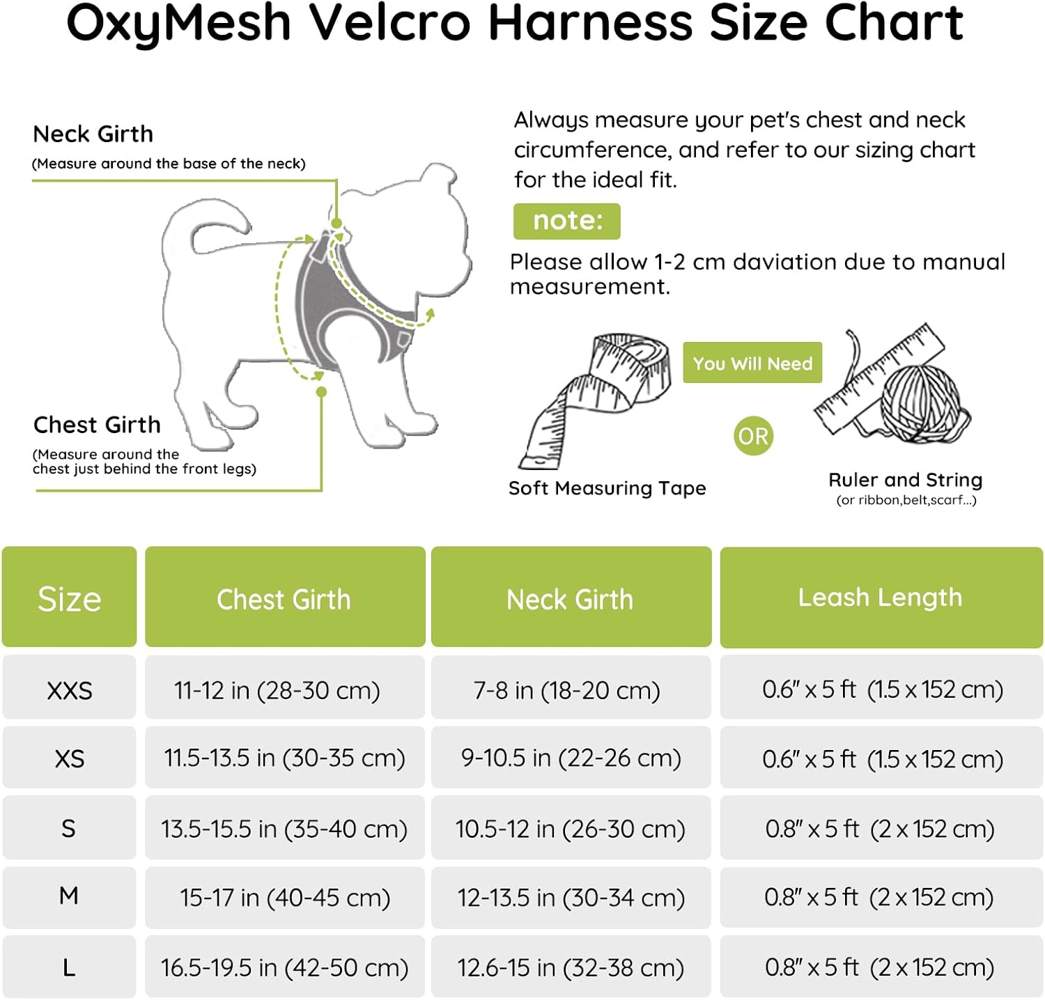 Измерете обиколката на врата и гърдите на вашето кученце и след това вижте таблицата с размери. Не избирайте само въз основа на теглото. Ако мерките на вашето кученце са между два размера, изберете по-големия размер за по-добро прилягане и комфорт. Този нагръдник за закопчаване позволява бързо използване, равномерно разпределя натиска на опъване, за да предотврати задавяне и увеличава комфорта. Здравата закопчалка, предпазната катарама и двойните D-образни пръстени предотвратяват случайно освобождаване.