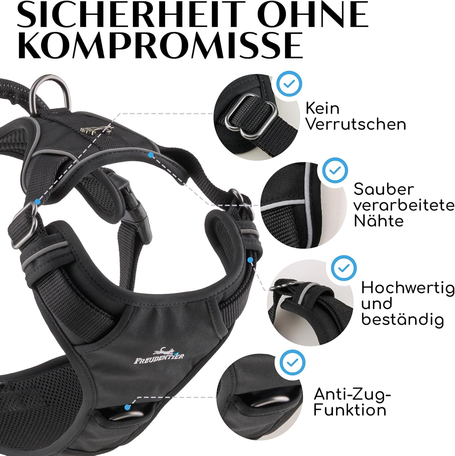 Нагръдник за кучета FREUDENTIER с дръжка, дишащ и подплатен - устойчив на бомби и максимална безопасност - Нагръдник против дърпане за малки, средни и големи кучета - Нагръдник за кучета (черен, L)