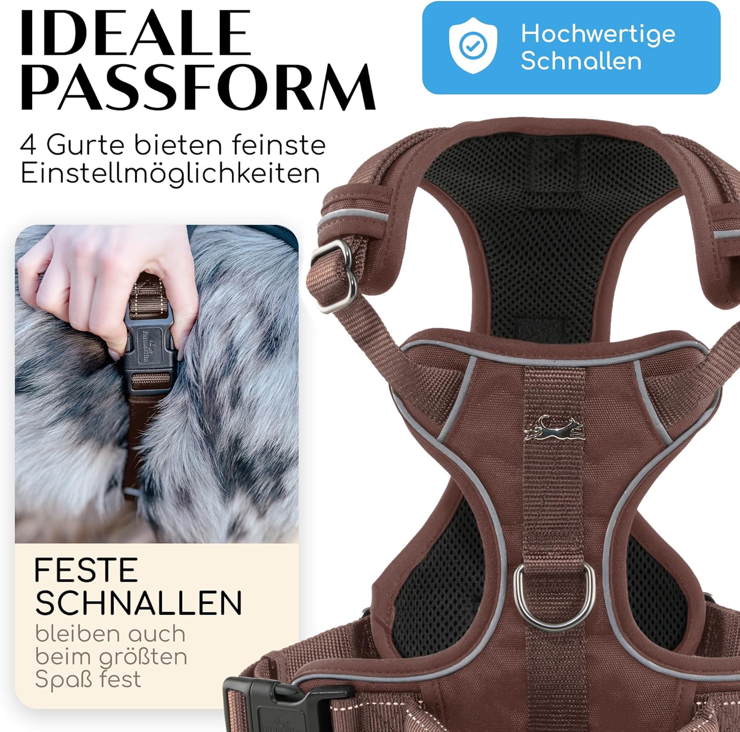 • Максимален комфорт при носене: пасва перфектно, държи сигурно. Благодарение на 4-посочната регулируемост, нагръдникът се адаптира перфектно към вашето куче - без хлъзгане, без прищипване. А най-хубавото? Лесен за поставяне.