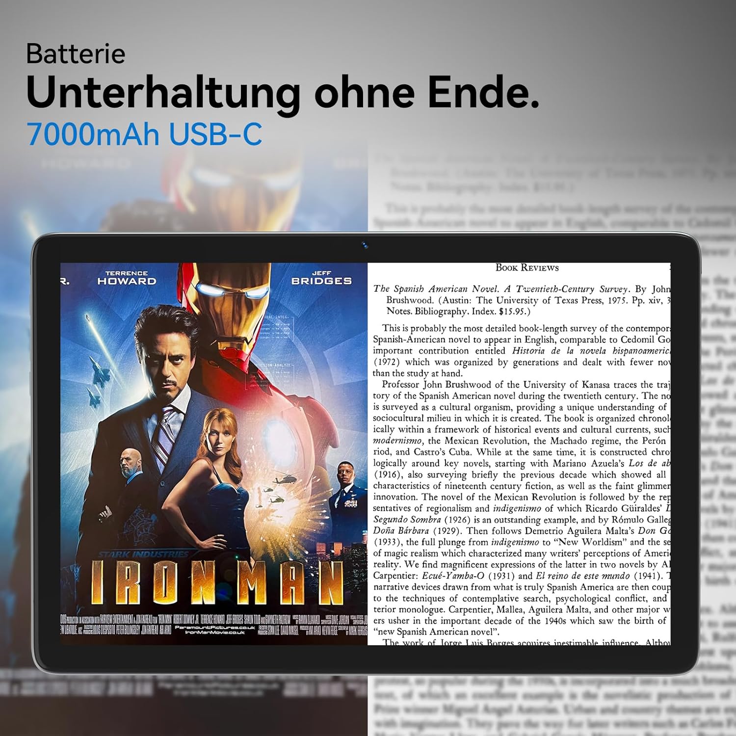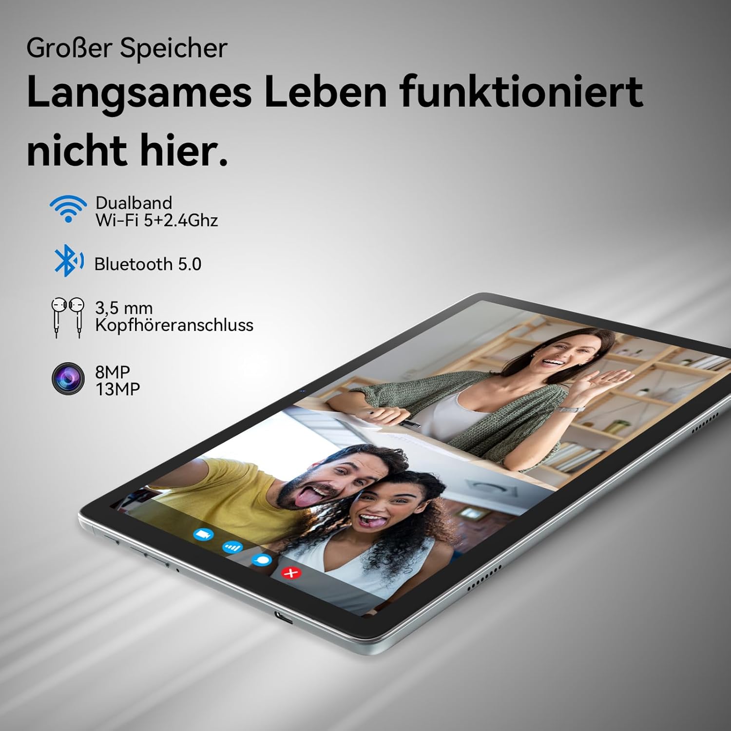 • 10,1-инчов таблет с 13MP камера: HD 1280 x 800 IPS сензорен екран със съотношение 16:10, широк ъгъл на видимост от 178 градуса и живи цветове. Разполага с 13MP задна двойна камера + 8MP предна камера за снимки и HD видео разговори. Този 10+-инчов таблет разполага с двойни стерео високоговорители с регулируема яркост на екрана, тъмна тема и режим за защита на очите, за да се предотврати напрежението в очите. Той също така разполага с 3,5 мм жак за слушалки и FM поддръжка (от 65 MHz до 108 MHz).