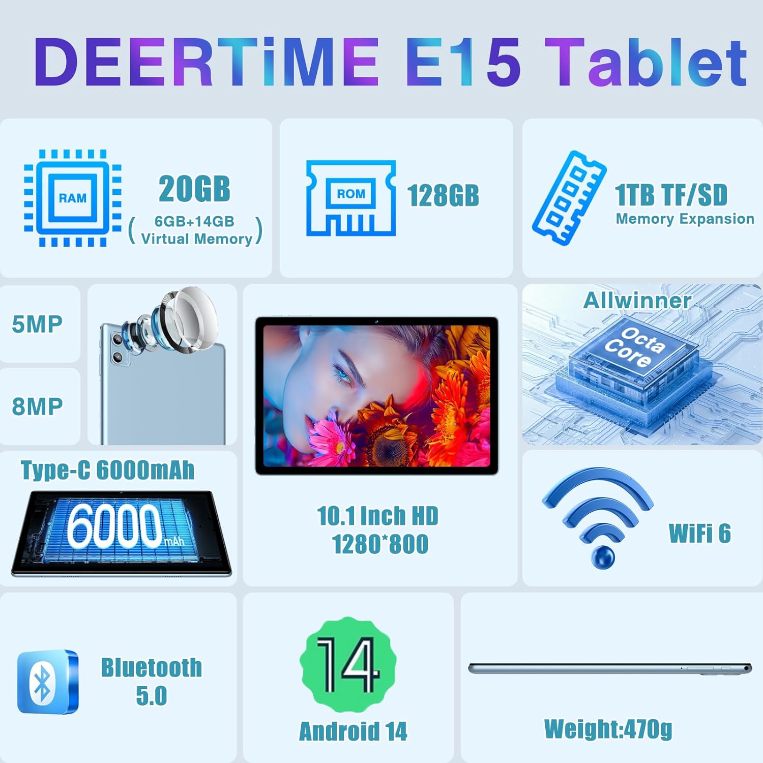 • ????【Android 14 и осемядрен процесор】Таблетът DEERTiME E6 е оборудван с най-новата версия на Android 14 и мощен осемядрен процесор, който ви потапя в свят на несравнима производителност. Насладете се на безпроблемна многозадачност и по-бързи скорости на обработка, за да останете ефективни и продуктивни през целия ден. Оптимизираната производителност на осемядрения процесор осигурява отзивчив потребителски интерфейс за бързо стартиране на приложения и плавно сърфиране.