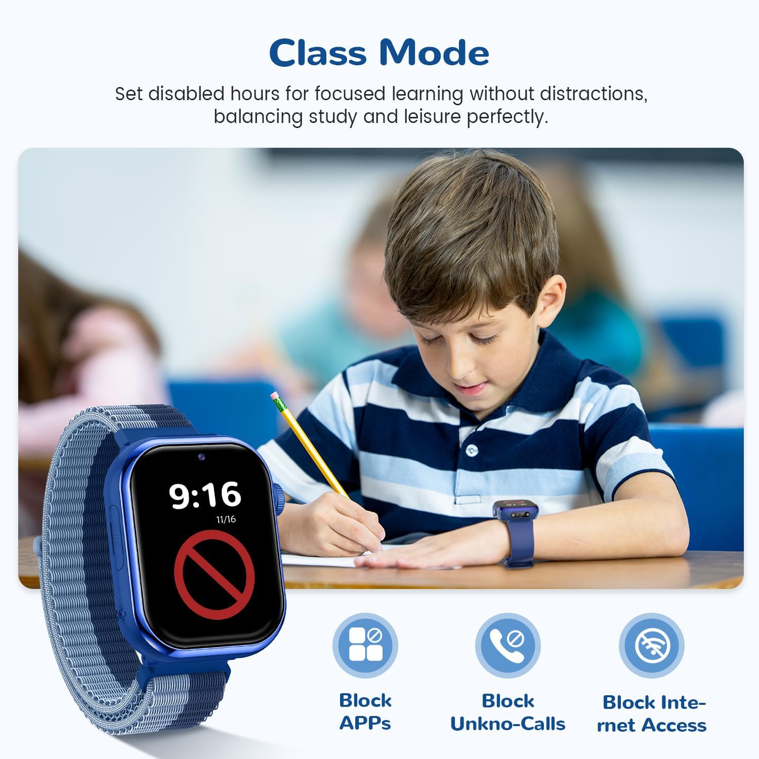 • Училищен режим за концентрирано учене: Родителите могат да зададат четири различни периода в „училищен режим“. Детският смарт часовник с GPS и SIM карта автоматично блокира игри, съобщения и обаждания през тези периоди и поддържа само показването на времето. Така децата могат да се фокусират и да учат ефективно. След час всички функции се възобновяват автоматично, което улеснява превключването между учене и почивка. Така децата могат да се фокусират по-добре, а родителите да се тревожат по-малко.