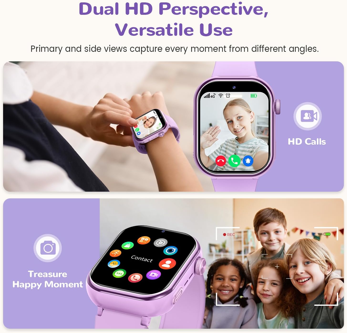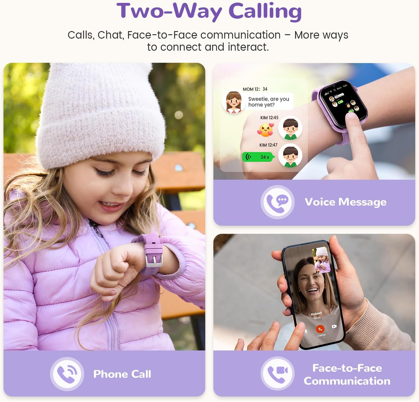 • 4G HD видео разговори с две кликвания: Напълно обновеният 4G детски смарт часовник с иновативен дизайн с две перспективи поддържа плавни видео разговори с висока резолюция в реално време с ясни и стабилни изображения. Така детето ви може да общува със семейството „лице в лице“ по всяко време и навсякъде и да споделя весели ежедневни моменти. Детският смарт часовник поддържа също гласови повиквания и текстов чат - различни комуникационни канали за по-тясна връзка между родител и дете, която съпътства всяка стъпка от растежа.