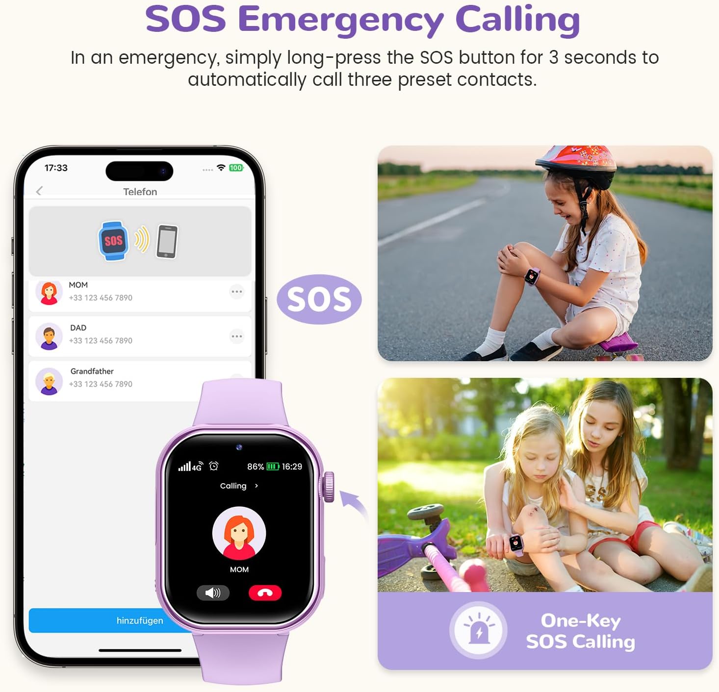• Спешно повикване SOS с един бутон: Ако детето ви попадне в спешен случай, натиснете и задръжте бутона SOS за три секунди. Детският смарт часовник 4G автоматично набира три предварително зададени номера за спешни случаи, докато се установи връзка. Това гарантира незабавна помощ. Родителите могат също да създадат списък с доверени обаждащи се в приложението, за да отхвърлят непознати повиквания и да блокират тормоза. Това дава на децата по-голямо чувство за сигурност, когато опознават света, а на родителите - повече безопасност.