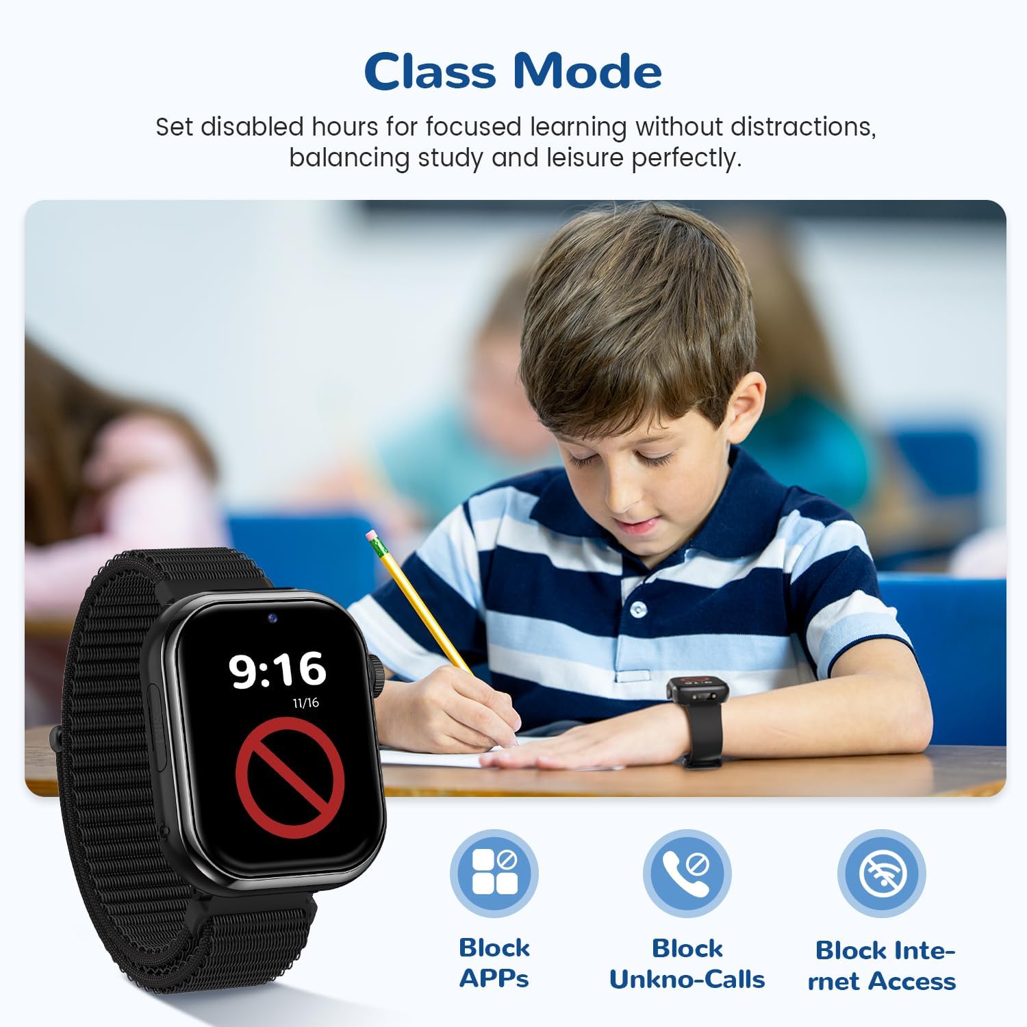 • Училищен режим за концентрирано учене: Родителите могат да зададат четири различни периода в „училищен режим“. Детският смарт часовник с GPS и SIM карта автоматично блокира игри, съобщения и обаждания през тези периоди и поддържа само показването на времето. Така децата могат да се фокусират и да учат ефективно. След час всички функции се възобновяват автоматично, което улеснява превключването между учене и почивка. Така децата могат да се фокусират по-добре, а родителите да се тревожат по-малко.