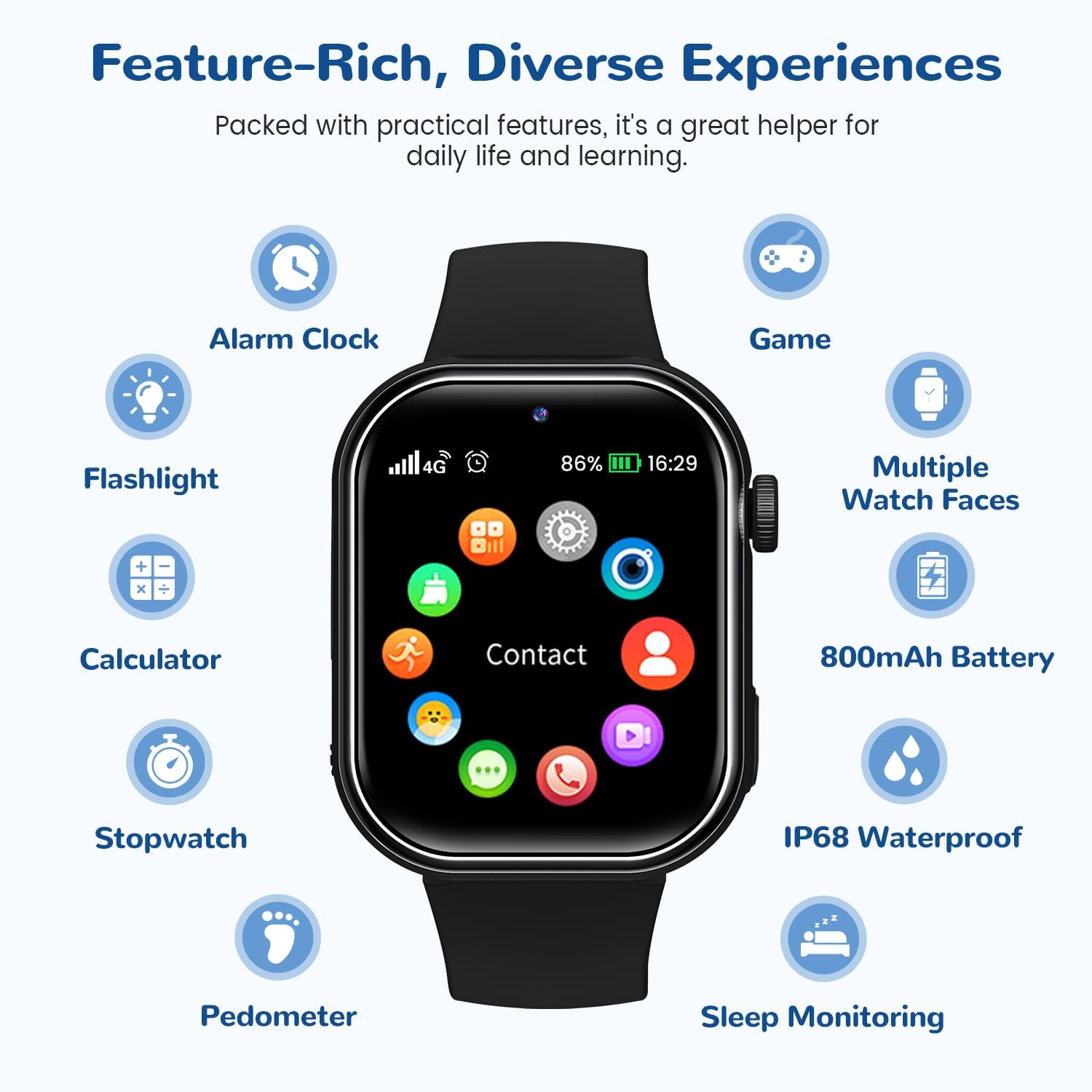 • Usage tips: This 4G children's smartwatch does not contain a SIM card. Please turn off the smart watch before inserting the SIM card. To use, insert the Nano 4G SIM card face up. Restart the smartwatch. Wait until the signal icon appears in the upper left corner of the smart watch to make and receive calls. Do not use this smart watch in the sauna or in a hot shower.