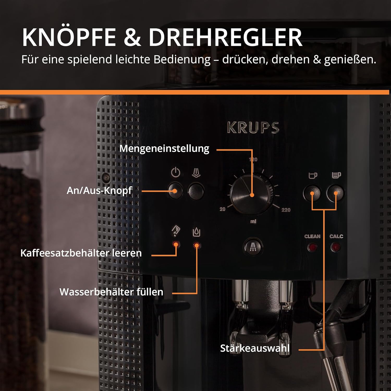 Напълно автоматична кафе машина Krups EA8108 (автоматично почистване, функция за 2 чаши, система за мляко с дюза CappucinoPlus, 15 бара, кафе машина, еспресо, кафе машина) черна