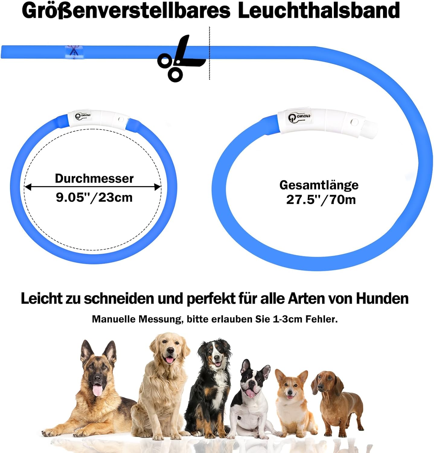 • Светещ нашийник за кучета с регулируема дължина: нашият светещ нашийник за кучета е изработен от висококачествен TPU, който е много твърд и лек. Светещият нашийник е дълъг 70 см и може лесно да се отреже до правилния размер за врата на вашето куче, така че да не губите време и пари за грешен размер. Този светещ нашийник е подходящ за всички видове кучета, като лабрадор, овчарка, корги и дакел.