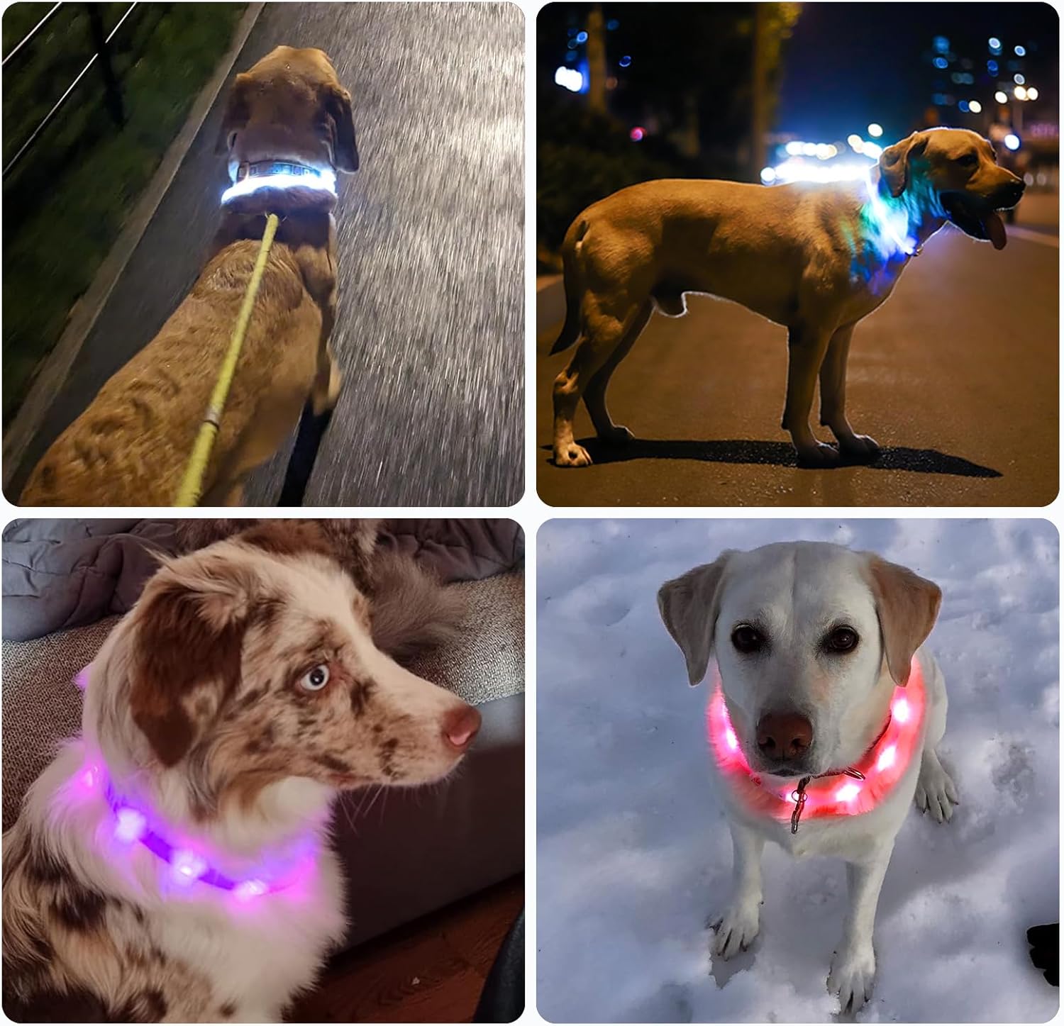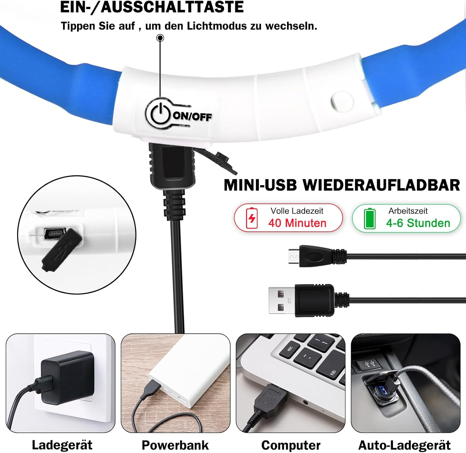 • Светещ нашийник за кучета с презареждаща се USB връзка: нашият презареждащ се светещ нашийник за кучета не изисква смяна на батерията. С включения кабел за зареждане може да се зарежда чрез зарядно устройство, външна батерия, лаптопи или компютри. Този светещ нашийник издържа 4-6 часа само с 40-минутно зареждане. Нека вашият четириног приятел се наслаждава на разходки, бягане, паркове за кучета и къмпингуване през зимните нощи.