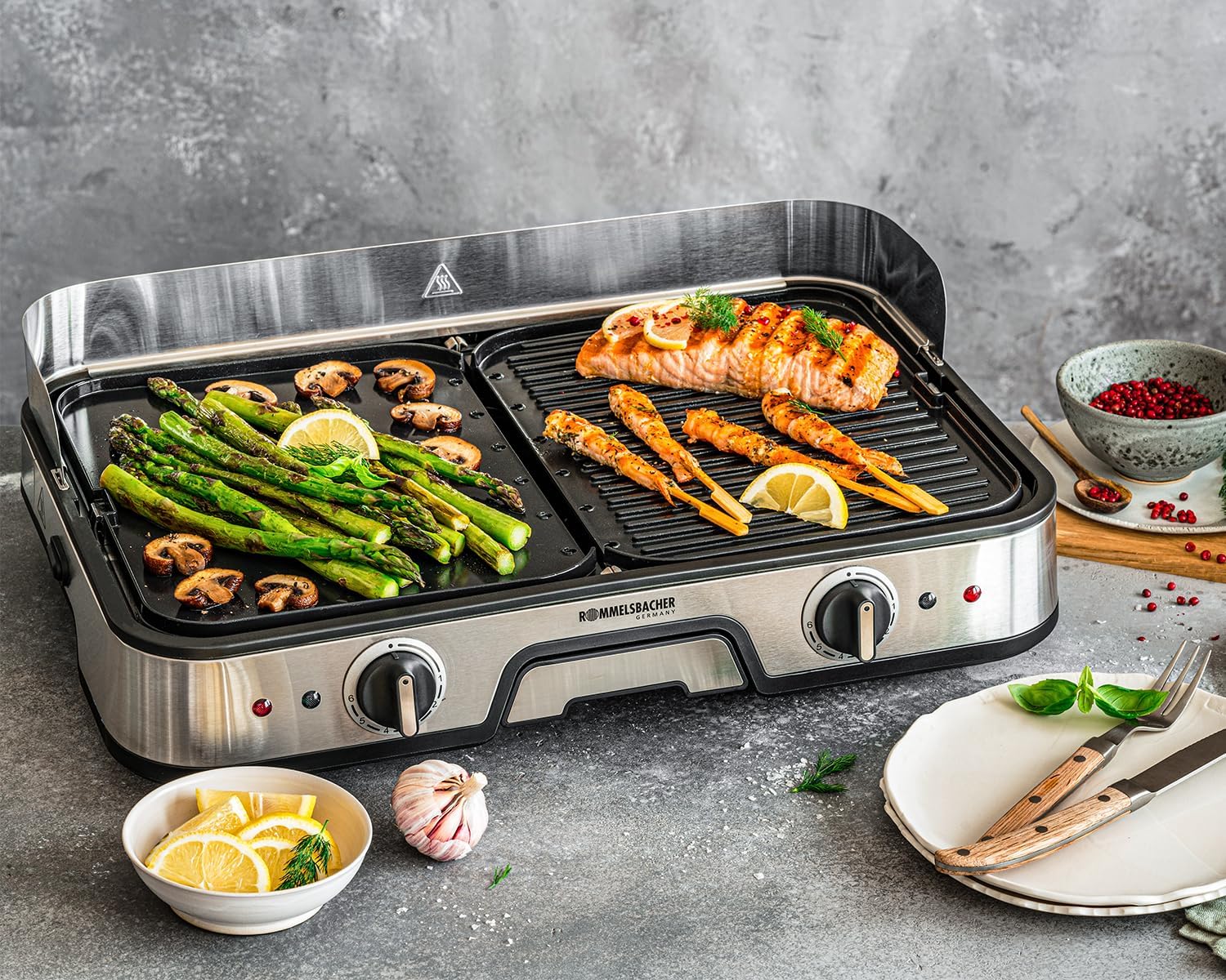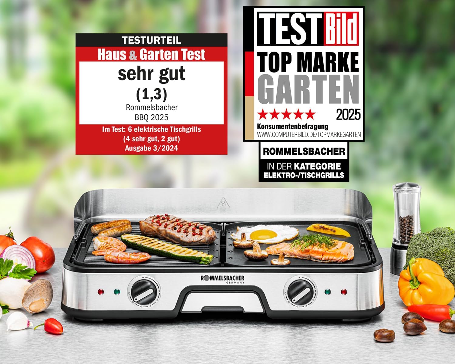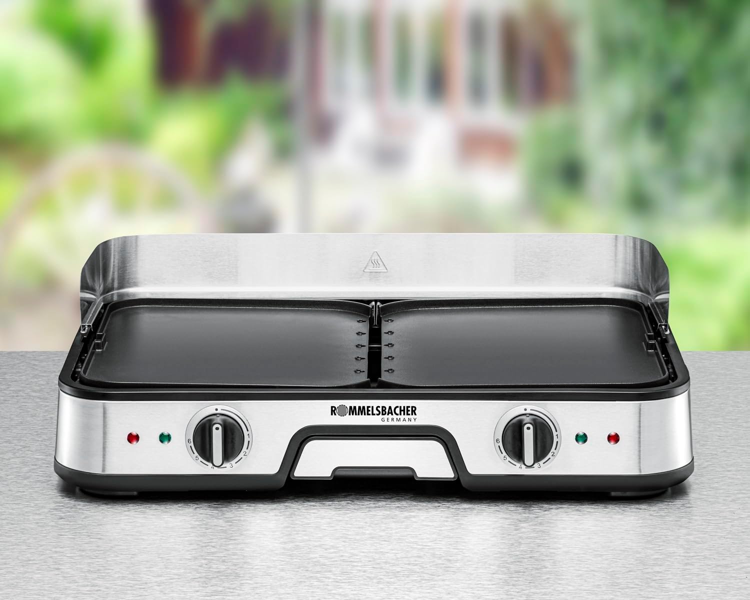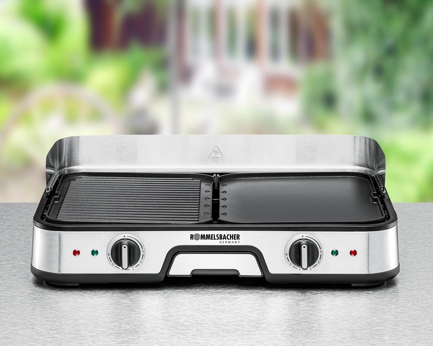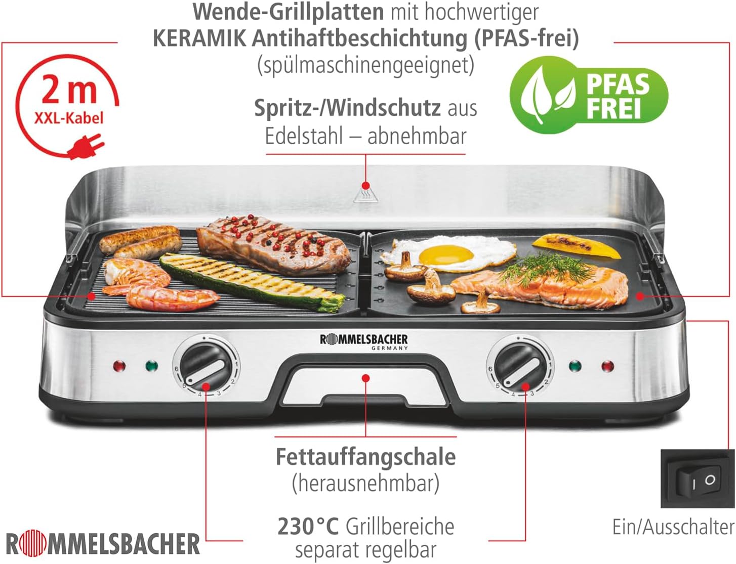 Настолен грил ROMMELSBACHER BBQ 2025, 2 обръщаеми грил плочи (оребрена и гладка), отделно регулируеми, керамично незалепващо покритие (без PFAS), температури до 230 °C, 2 м кабел, 2000 W