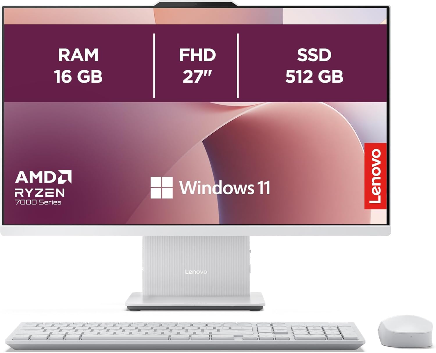Настолен компютър Lenovo IdeaCentre All-in-One, 27-инчов FHD дисплей, AMD Ryzen 5 7535HS, 512 GB SSD, 16 GB RAM, безжична станция за зареждане на смартфон, високоговорители, WiFi 6, Windows 11 H, безжична клавиатура и мишка