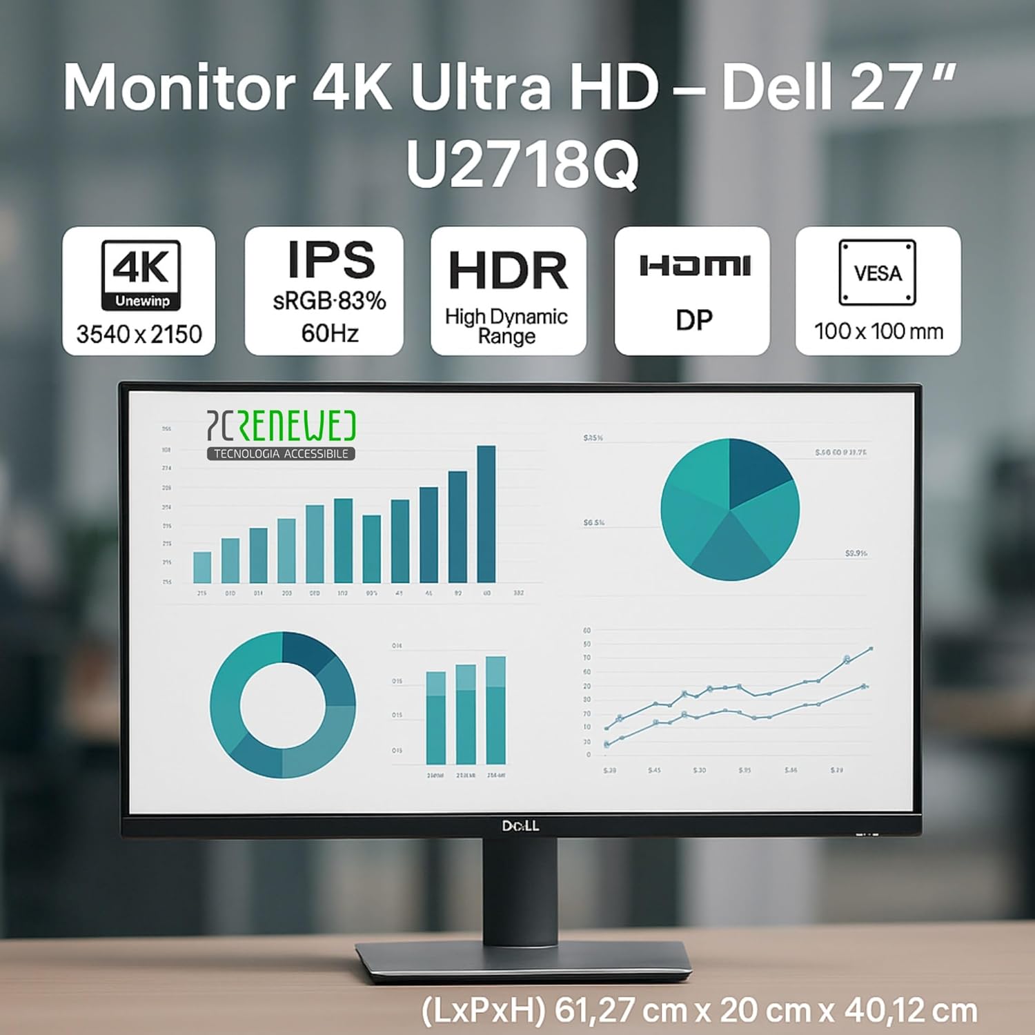 Dell UltraSharp 27" 4K UHD Monitor – scharfe und realistische BilderDer Dell U2718Q 27" UltraSharp 4K-Monitor mit einer Auflösung von 3840 x 2160, IPS-Technologie und einem Kontrast von 1000:1 bietet ein hervorragendes visuelles Erlebnis. Perfekt für alle, die mit visuellen Inhalten, Grafikbearbeitung, CAD arbeiten oder einfach nur höchste visuelle Qualität wünschen.