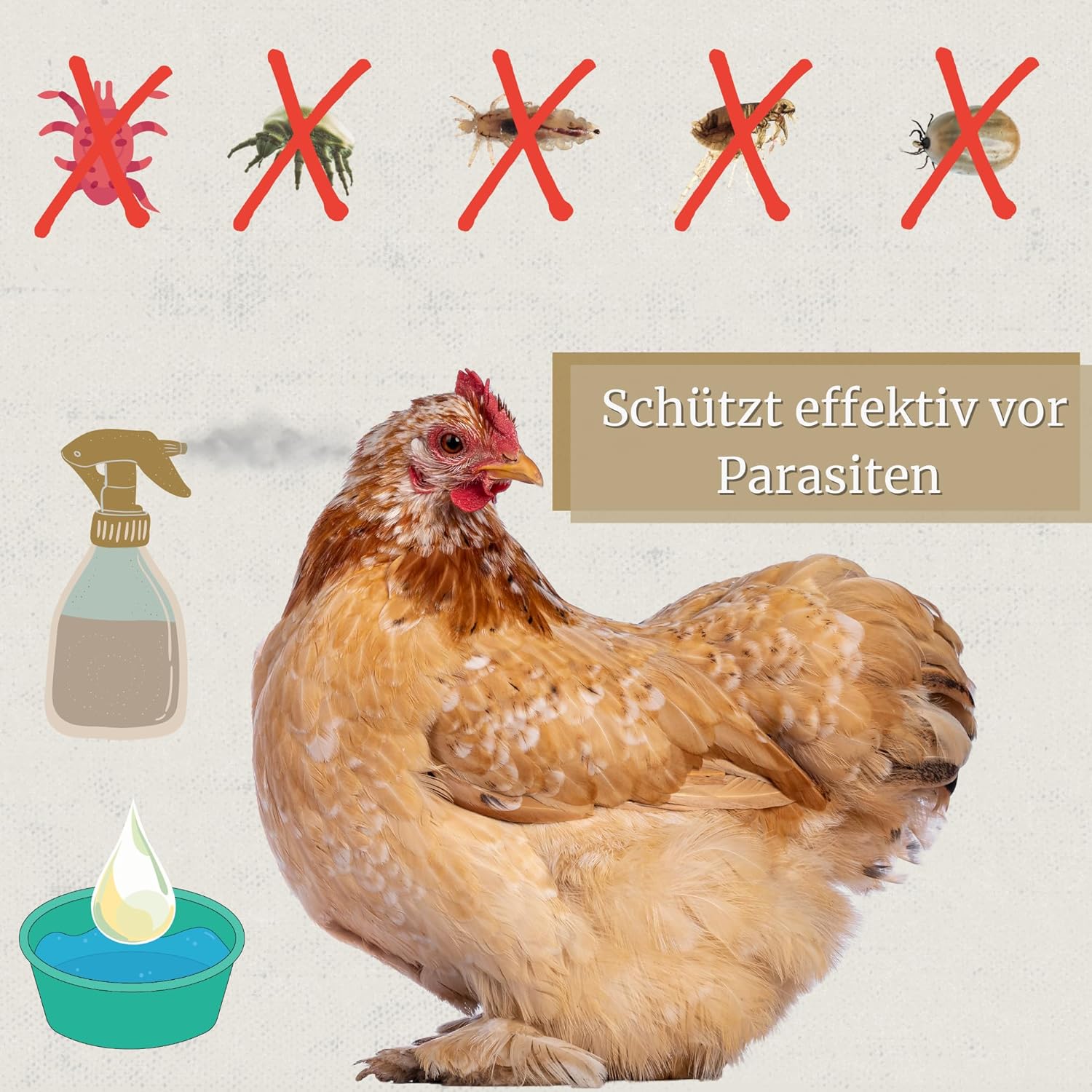 • Ефективна превантивна употреба: Проектиран за безопасно и ефективно предотвратяване на паразити при пилета, домашни птици и екзотични животни, за да поддържа вашето здраве и това на вашите домашни птици в дългосрочен план.