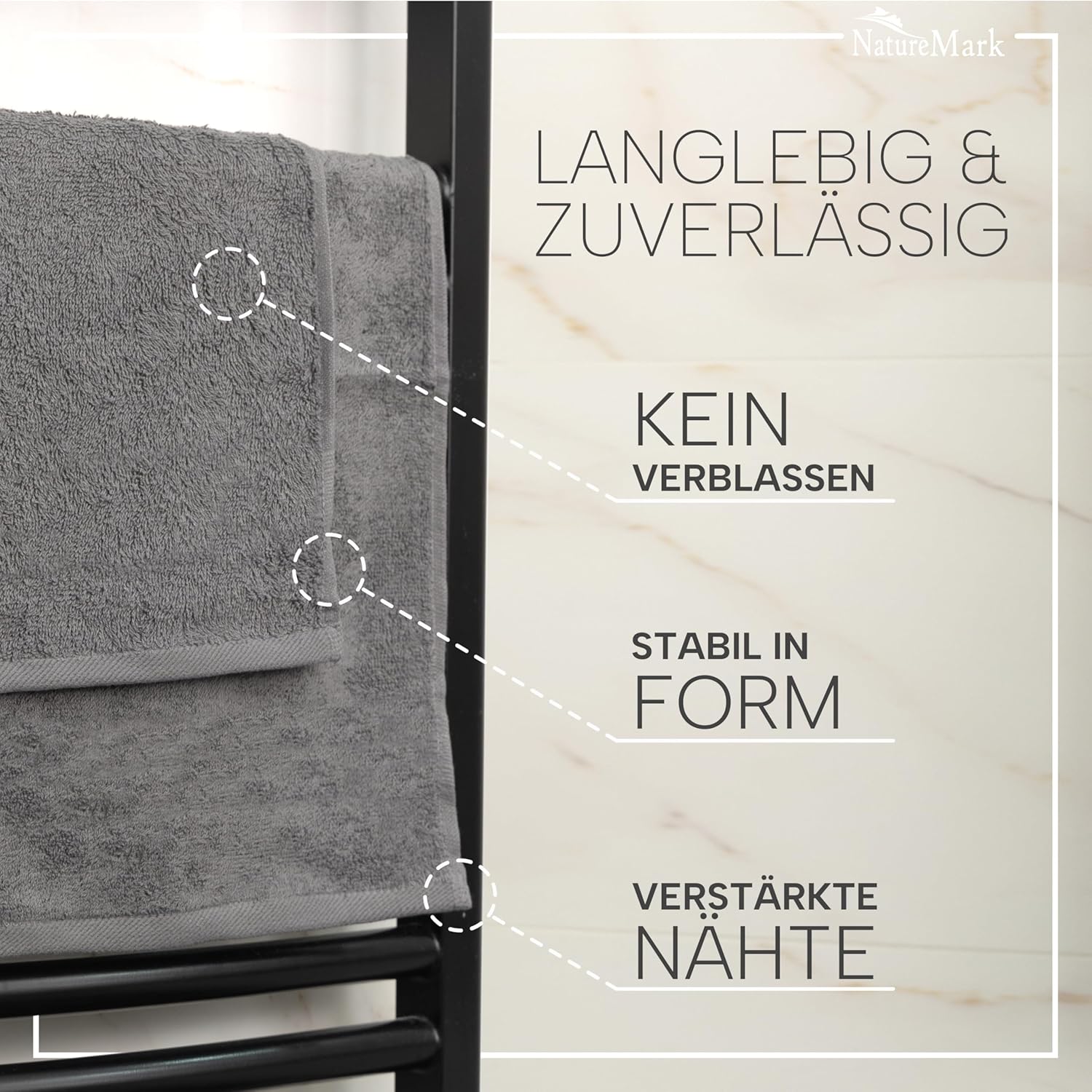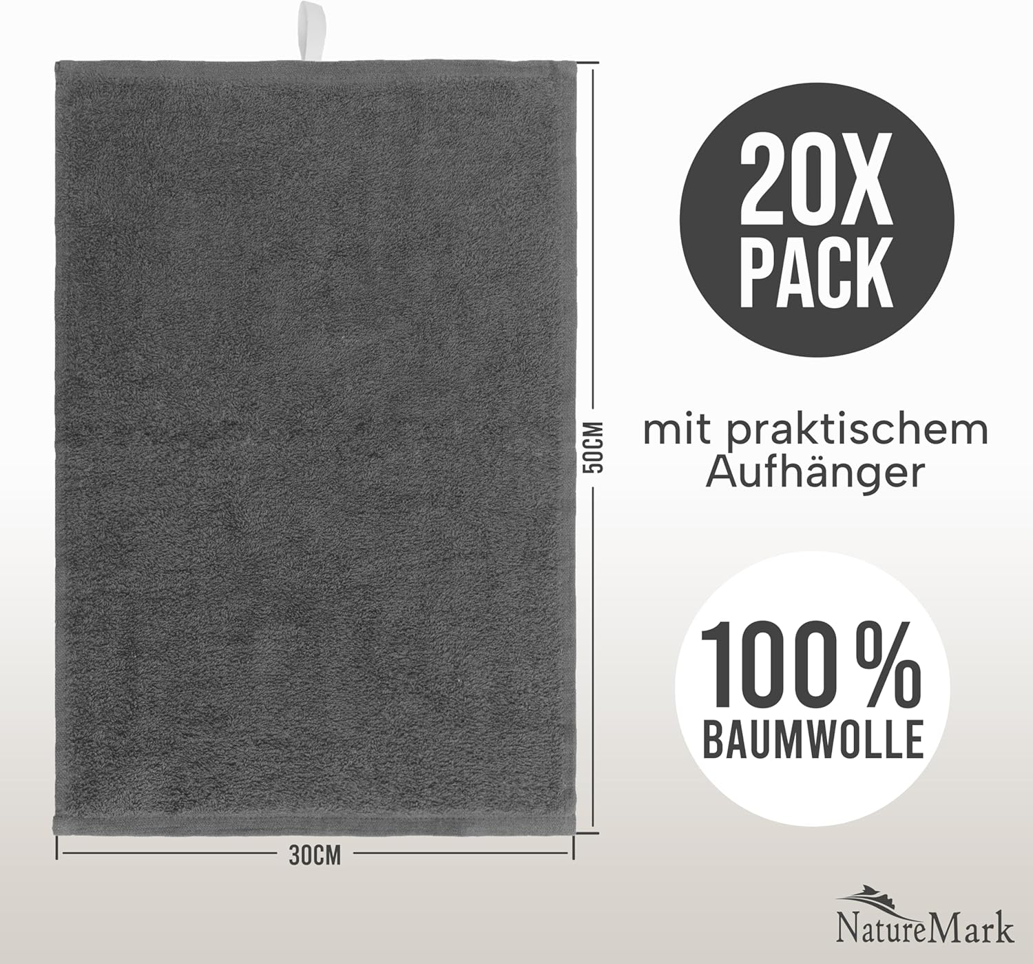 Пакет от 20 хавлиени кърпи за гости, 100% памук, отлично съотношение цена-качество. Марков продукт от NatureMark – тествано качество съгласно Oeko-Tex Standard 100 – класически хавлиени кърпи за гости: качество 400 г/м², с халка за закачане – модерен дизайн, съдържание на кутията: 20 x кърпи за гости, размер: 30 x 50 см