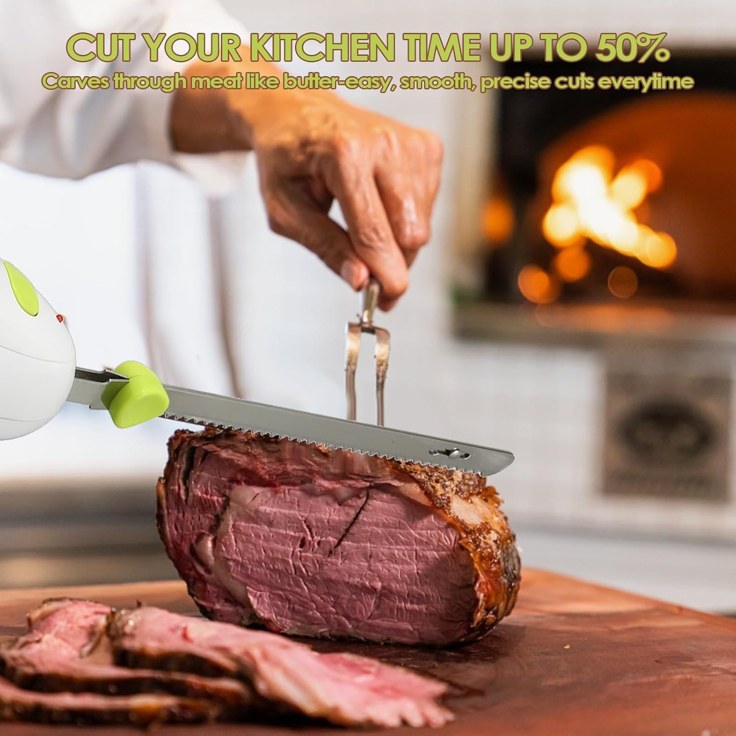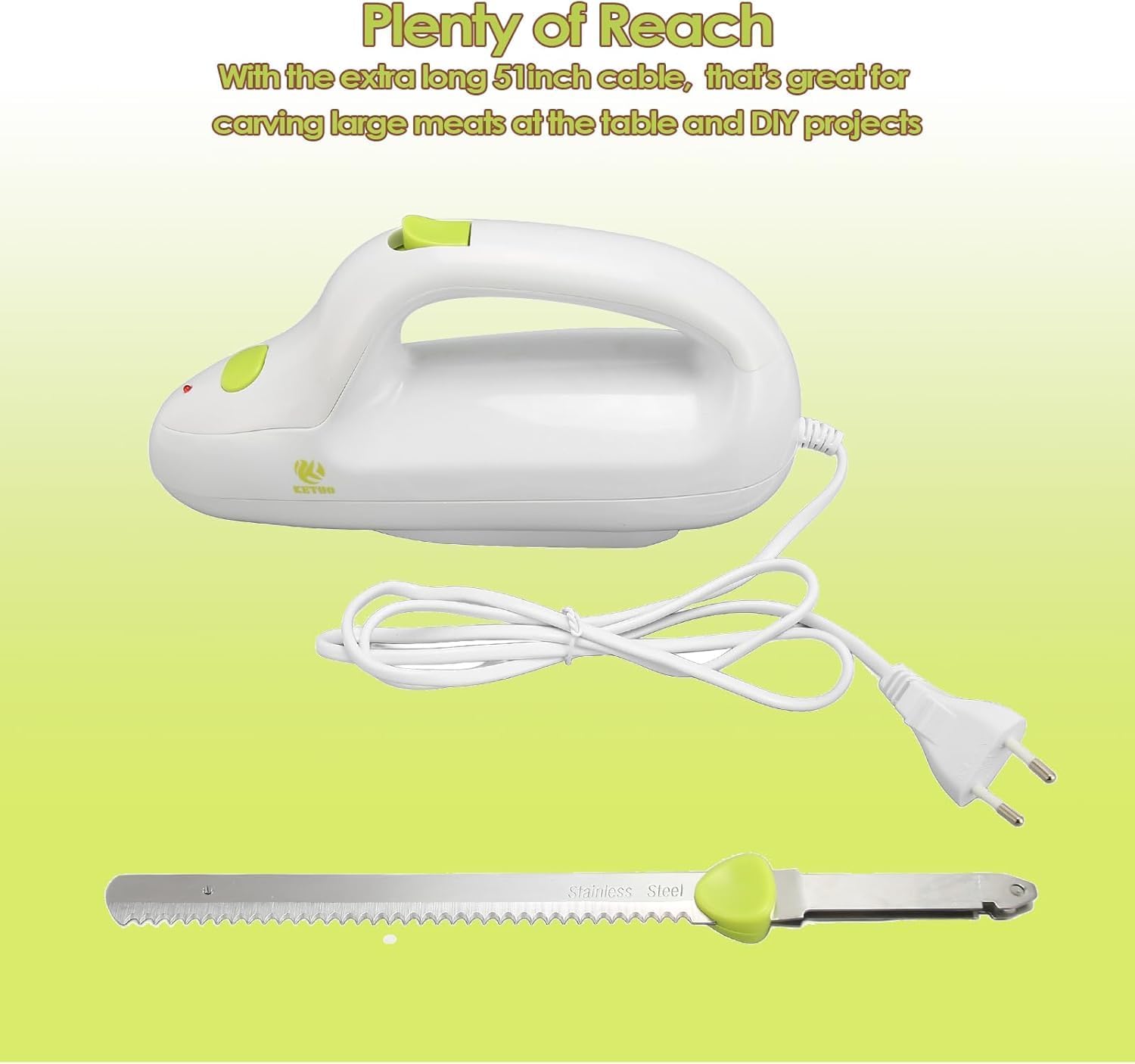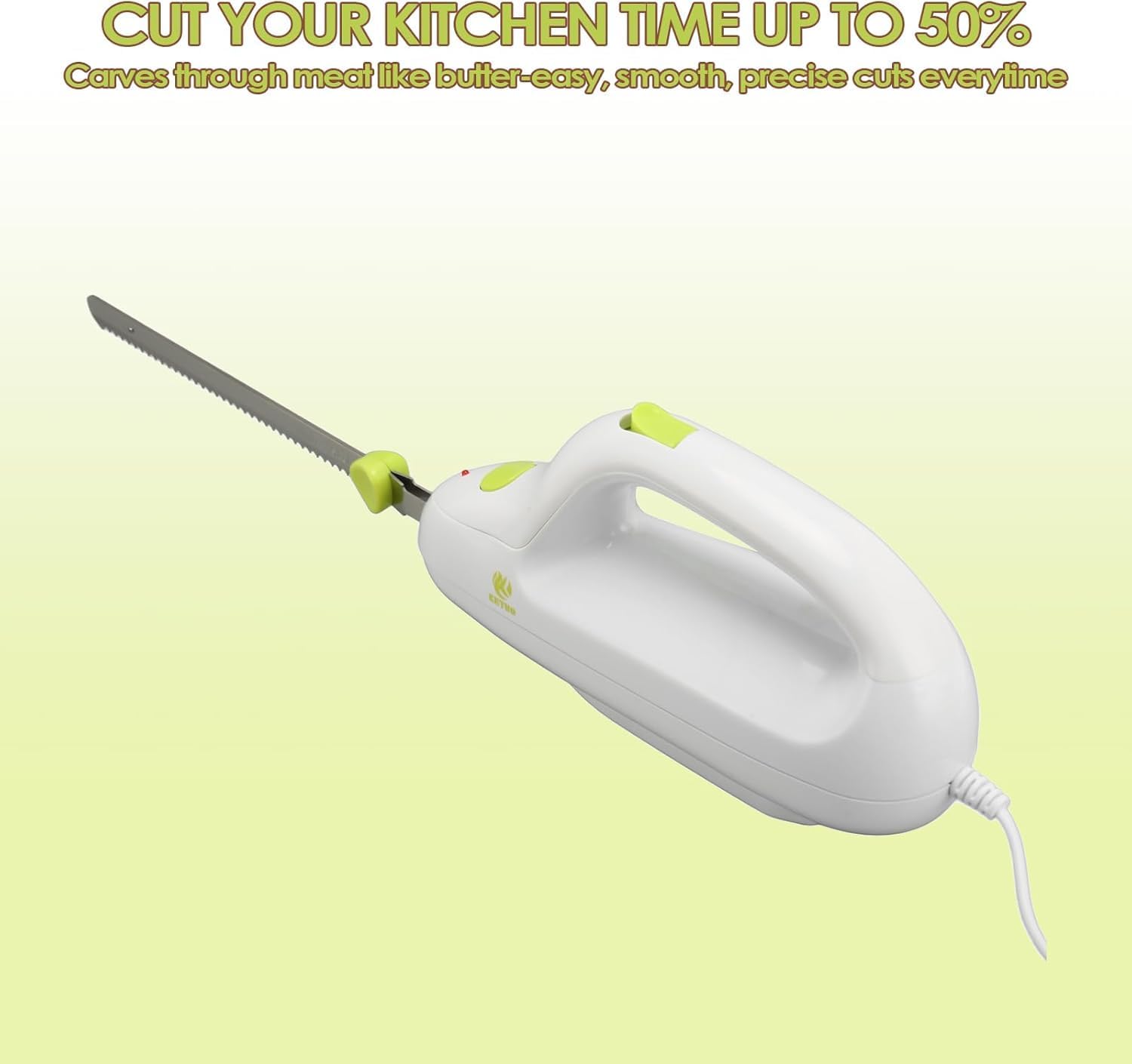 • ОСТРИЕ ОТ НЕРЪЖДАЕМА СТОМАНА Този електрически нож е изработен от неръждаема стомана с двойни остриета с назъбени остриета, които осигуряват равномерни резени. Издръжлив и устойчив на ръжда за дълготрайна употреба.