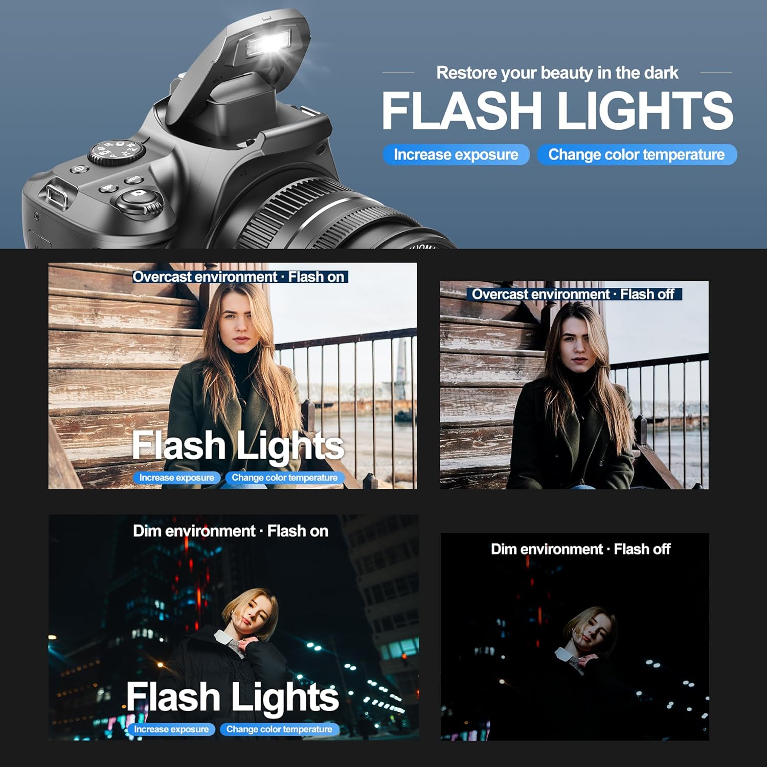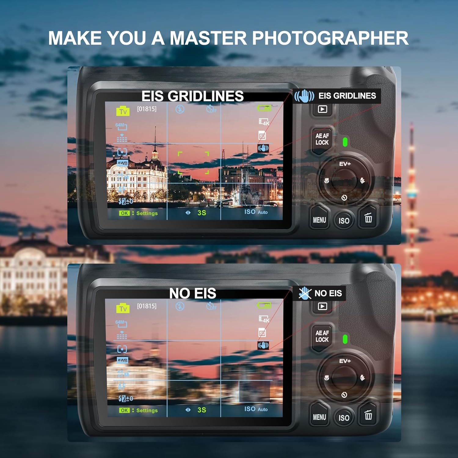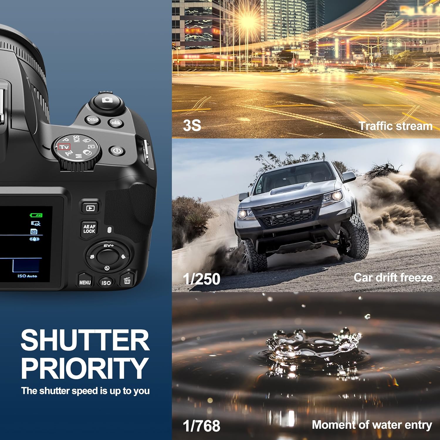 • 【Професионални фото възможности】Подобрете фото изживяването си с този универсален цифров фотоапарат, за да заснемате предавания на живо с невероятна яснота и детайлност. Неговите 64 MP осигуряват изключително качество на изображението, а ръчното регулиране на размера на блендата и скоростта на затвора осигурява по-добър творчески контрол и настройка на сцената.