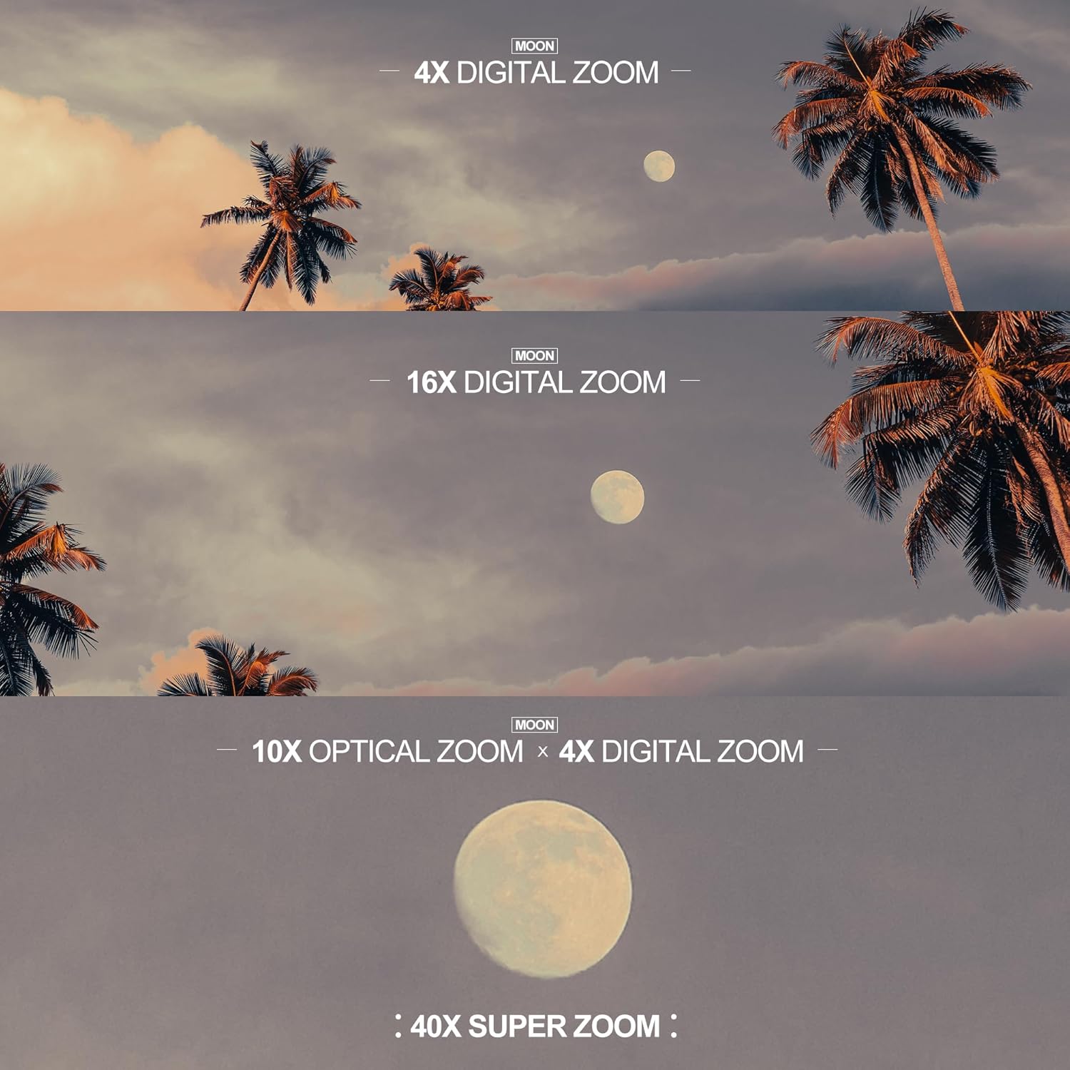 • 40x увеличение: С мощния си 40x ефект на увеличение, този фотоапарат заснема отдалечени обекти с невероятни детайли. Идеален за фотография на дивата природа, концертни представления или дори през нощта на лунна светлина. Комбинацията от 10x оптично увеличение и 4x цифрово увеличение осигурява гъвкавост при снимане и гарантира, че никога няма да пропуснете нито един момент.