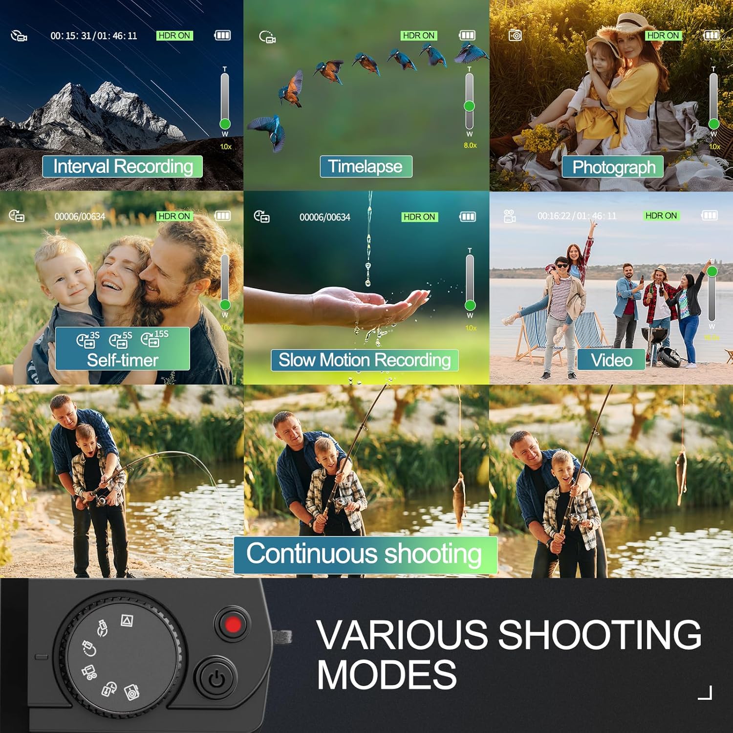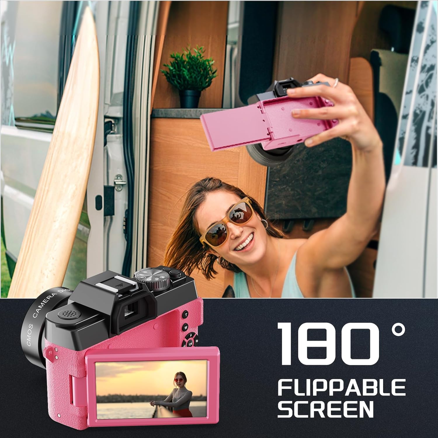 NBD 5K цифров фотоапарат 48MP с автофокус и 16x увеличение, 3-инчов 180° сгъваем дисплей, WiFi - Включва широкоъгълен/макро обектив + 2 батерии (32GB карта + микрофон) Розов
