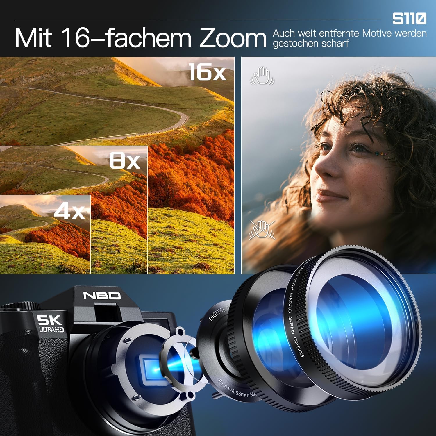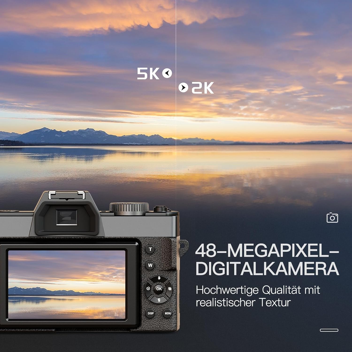 NBD 5K цифрова камера за фотография и влогване, 48 MP/60 fps камера с WiFi и управление чрез приложение, компактна камера с 32 GB TF карта (черна)