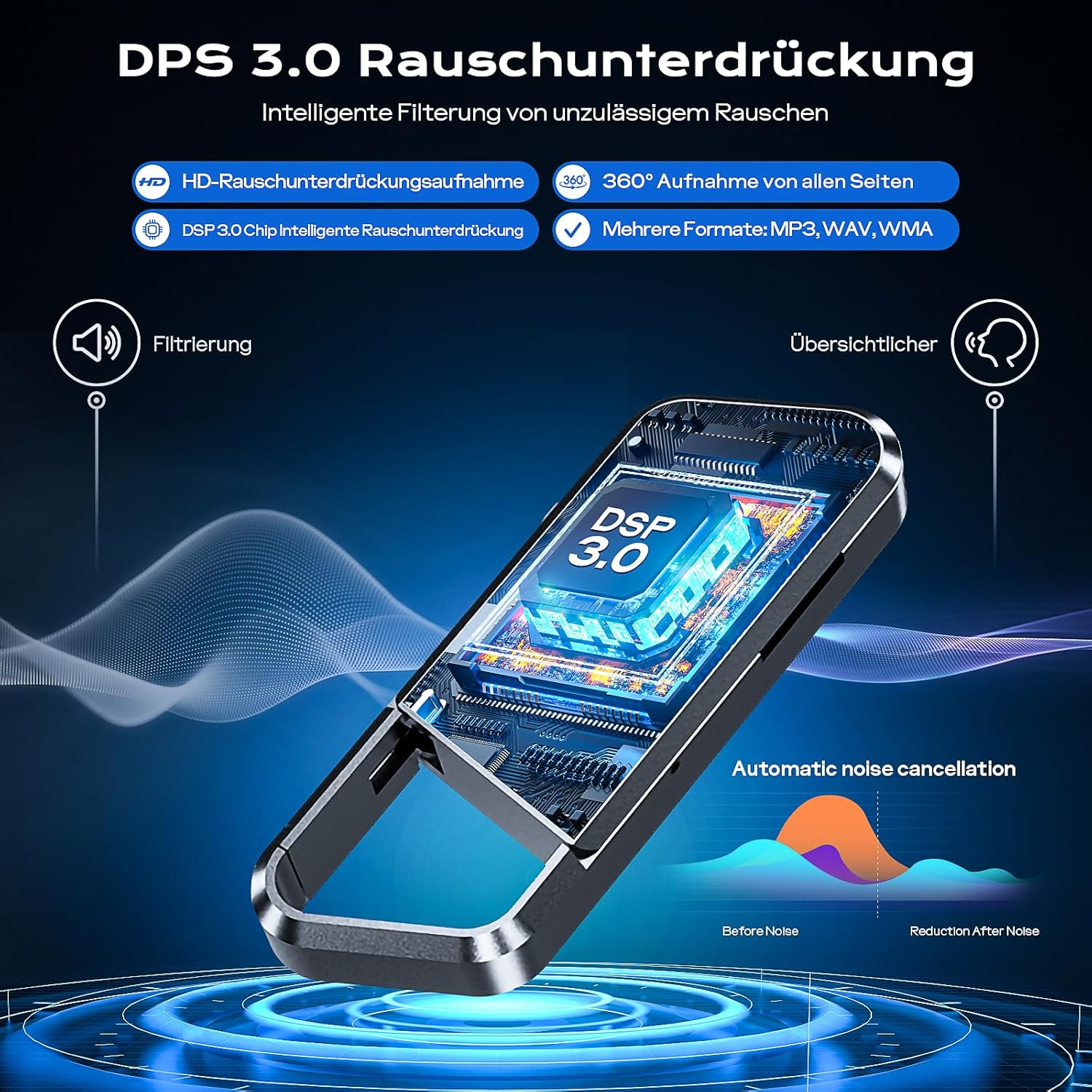 • Интелигентно DSP намаляване на шума и 360° панорамен запис: Благодарение на усъвършенстваната DSP технология за намаляване на шума, този гласов рекордер филтрира фоновия шум, така че получавате ясни, естествени записи дори в шумна среда, което го прави идеален за групови срещи, подкасти или публични събития. Записващо устройство, което точно възпроизвежда реалистични обеми.