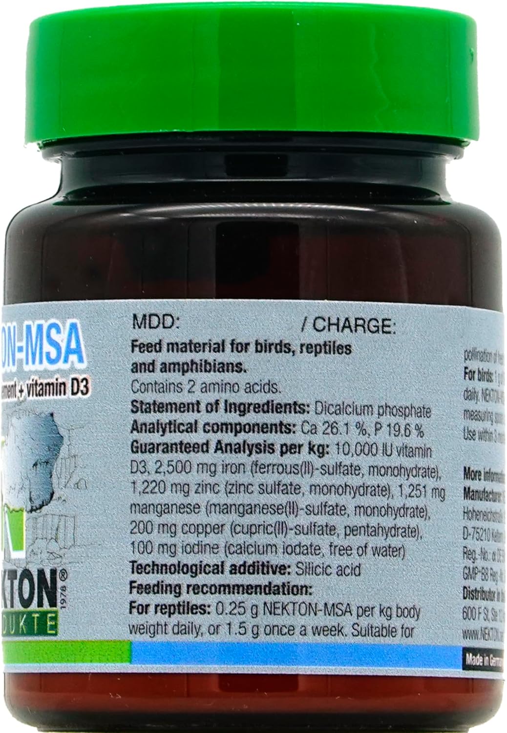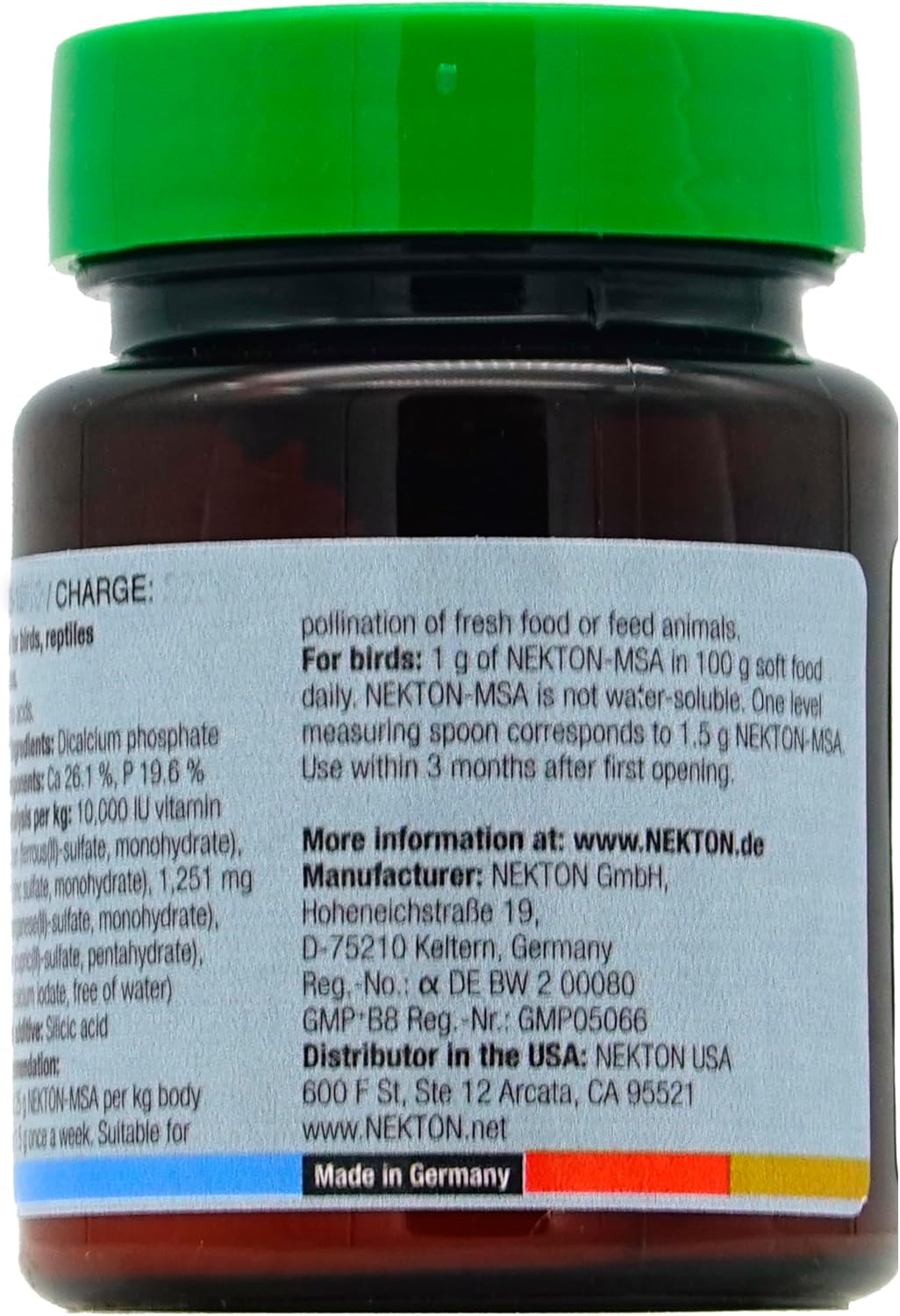 NEKTON-MSA е висококачествена минерална смес, допълнена с витамин D3, макро- и микроелементи, и аминокиселини. NEKTON-MSA поддържа и подхранва метаболизма и костите, предотвратява рахит, активира метаболитните процеси и помага за компенсиране на уврежданията, причинени от дефицит на калций. NEKTON-MSA отговаря на повишените минерални нужди по време на размножаване и отглеждане, предпазва от малабсорбция, засилва имунната система и предотвратява чупливостта на яйцата при птиците. NEKTON-MSA подпомага здравословното развитие на костите при младите птици. Това е особено важно при младите птици, за да се предотвратят по-късни заболявания, причинени от дефицит на витамини и минерали. NEKTON-MSA не е водоразтворим и може лесно да се смеси с мека храна или песъчлив пясък. ДОПЪЛНИТЕЛНА ИНФОРМАЦИЯ: Минералите (макро- и микроелементи) са вещества, които са основни компоненти на предлаганата храна, което означава, че са незаменими за метаболизма на всички животни. Тъй като микроелементите се отделят от тялото на животното, те винаги трябва да присъстват във храната. Както подсказва терминът "микроелементи", тези вещества са необходими само в много малки количества (следи). Важно е да се предлага на животното минерална смес, която не се определя само от броя и количеството на отделните вещества, а по-скоро от балансирания ѝ състав, съобразен с нуждите на организма на животното. Количествата и микроелементите, витамините и аминокиселините трябва да се допълват взаимно и да не пречат на ефектите си. Тези критерии са били специално взети предвид при формулирането на NEKTON-MSA, така че собствениците да могат да бъдат сигурни, че осигуряват на своите животни възможно най-доброто снабдяване с тези елементи.
