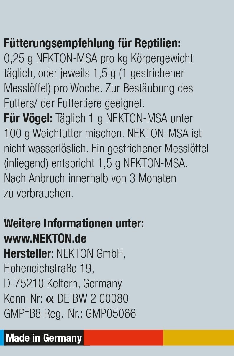 NEKTON-MSA е висококачествена минерална смес, допълнена с витамин D3, макро- и микроелементи, и аминокиселини. NEKTON-MSA поддържа и подхранва метаболизма и костите, предотвратява рахит, активира метаболитните процеси и помага за компенсиране на уврежданията, причинени от дефицит на калций. NEKTON-MSA отговаря на повишените минерални нужди по време на размножаване и отглеждане, предпазва от малабсорбция, засилва имунната система и предотвратява чупливостта на яйцата при птиците. NEKTON-MSA подпомага здравословното развитие на костите при младите птици. Това е особено важно при младите птици, за да се предотвратят по-късни заболявания, причинени от дефицит на витамини и минерали. NEKTON-MSA не е водоразтворим и може лесно да се смеси с мека храна или песъчлив пясък. ДОПЪЛНИТЕЛНА ИНФОРМАЦИЯ: Минералите (макро- и микроелементи) са вещества, които са основни компоненти на предлаганата храна, което означава, че са незаменими за метаболизма на всички животни. Тъй като микроелементите се отделят от тялото на животното, те винаги трябва да присъстват във храната. Както подсказва терминът "микроелементи", тези вещества са необходими само в много малки количества (следи). Важно е да се предлага на животното минерална смес, която не се определя само от броя и количеството на отделните вещества, а по-скоро от балансирания ѝ състав, съобразен с нуждите на организма на животното. Количествата и микроелементите, витамините и аминокиселините трябва да се допълват взаимно и да не пречат на ефектите си. Тези критерии са били специално взети предвид при формулирането на NEKTON-MSA, така че собствениците да могат да бъдат сигурни, че осигуряват на своите животни възможно най-доброто снабдяване с тези елементи.