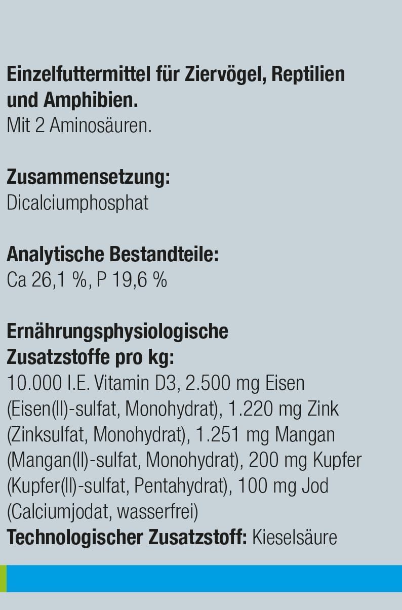 Dicalciumphosphat, Kieselsäure, Analytische Bestandteile: Ca 23,7 %, P 17,4 %, Ernährungsphysiologische Zusatzstoffe pro kg: 10.000 I.E. Vitamin D3, 3.000 mg Eisen (Eisen-(II)-sulfat), 1.255 mg Zink (Zinksulfat), 1.255 mg Mangan (Manganoxid), 250 mg (Kupfer-(II)-sulfat), 100 mg Jod (Calciumjodat), 40 mg Cobalt (Cobalt-II-sulfat).