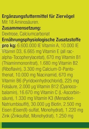 Състав: Декстроза, калциев карбонат, силициев диоксид. Хранителни добавки на кг: 6 600 000 IU витамин А, 10 000 IU витамин D3, 6 600 мг витамин Е, 670 мг витамин B1 (тиамин хидрохлорид), 1 680 мг витамин B2 (рибофлавин), 3 300 мг пантотенова киселина (калциев D-пантотенат), 10 000 мг ниацинамид, 670 мг витамин B6 (пиридоксин хидрохлорид), 225 мг фолиева киселина, 2 000 μg витамин B12, 16 670 мг витамин C (L(+)-аскорбинова киселина), 1 330 мг витамин K3 (менадион натриев бисулфит), 30 000 μg биотин, 3 000 мг желязо (железен сулфат). 1220 мг цинк (цинков сулфат), 1250 мг манган (манганов оксид), 250 мг мед (меден II сулфат), 100 мг йод (калциев йодат)