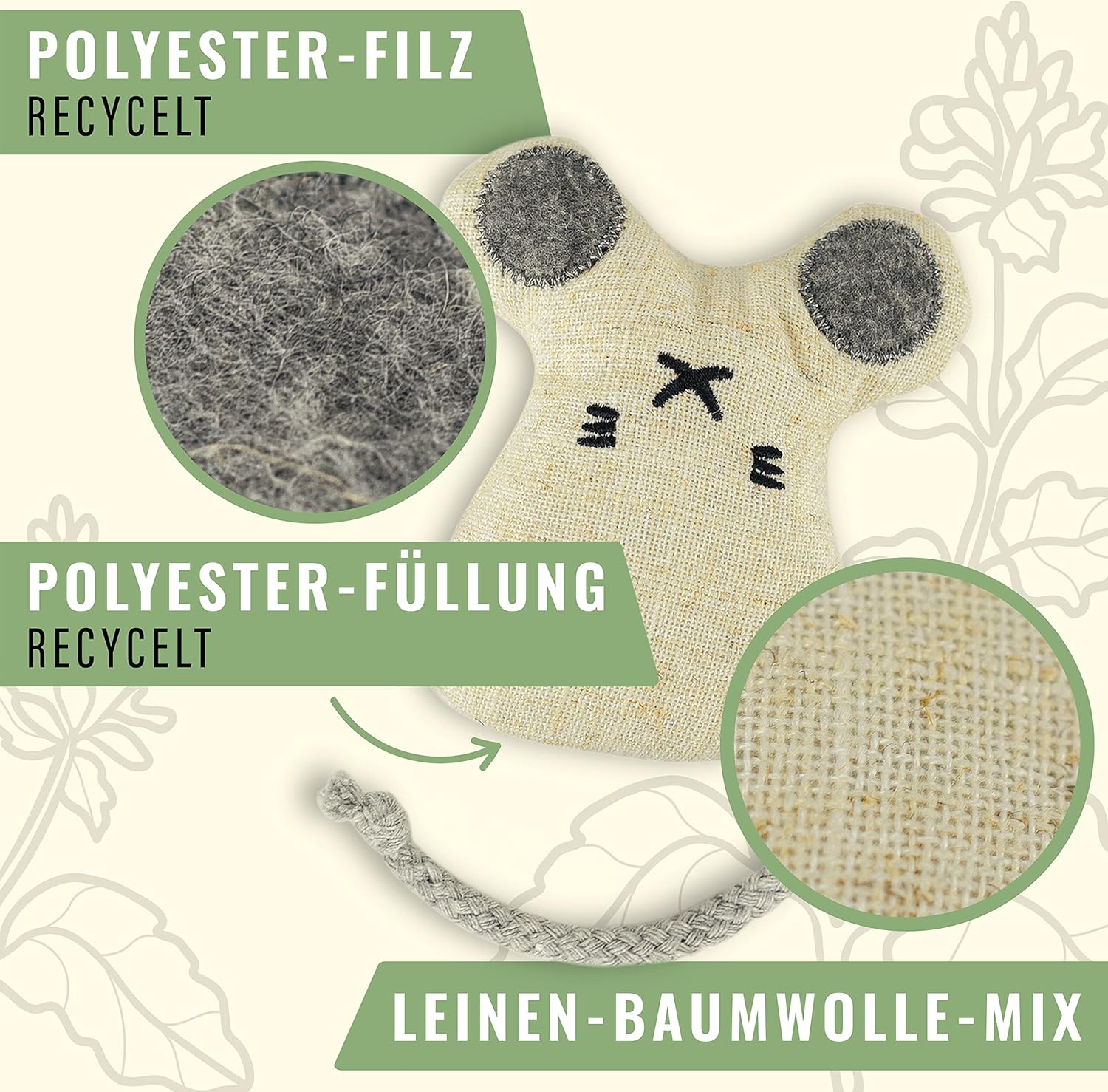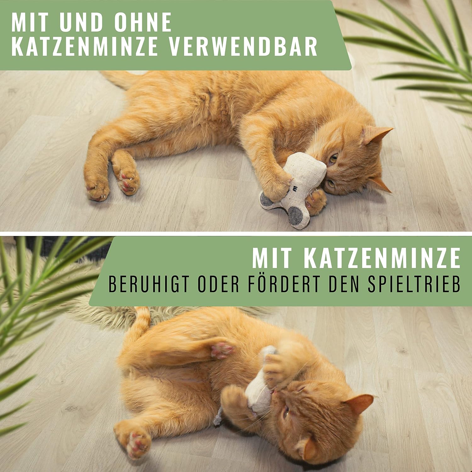 • ️ Здрава - Хигиенична - Устойчива - Играчката котешка трева е изработена от висококачествена смес от памук и лен и е пълна с мека, рециклирана полиестерна вата. Играчките животни могат да се перат на 30°C