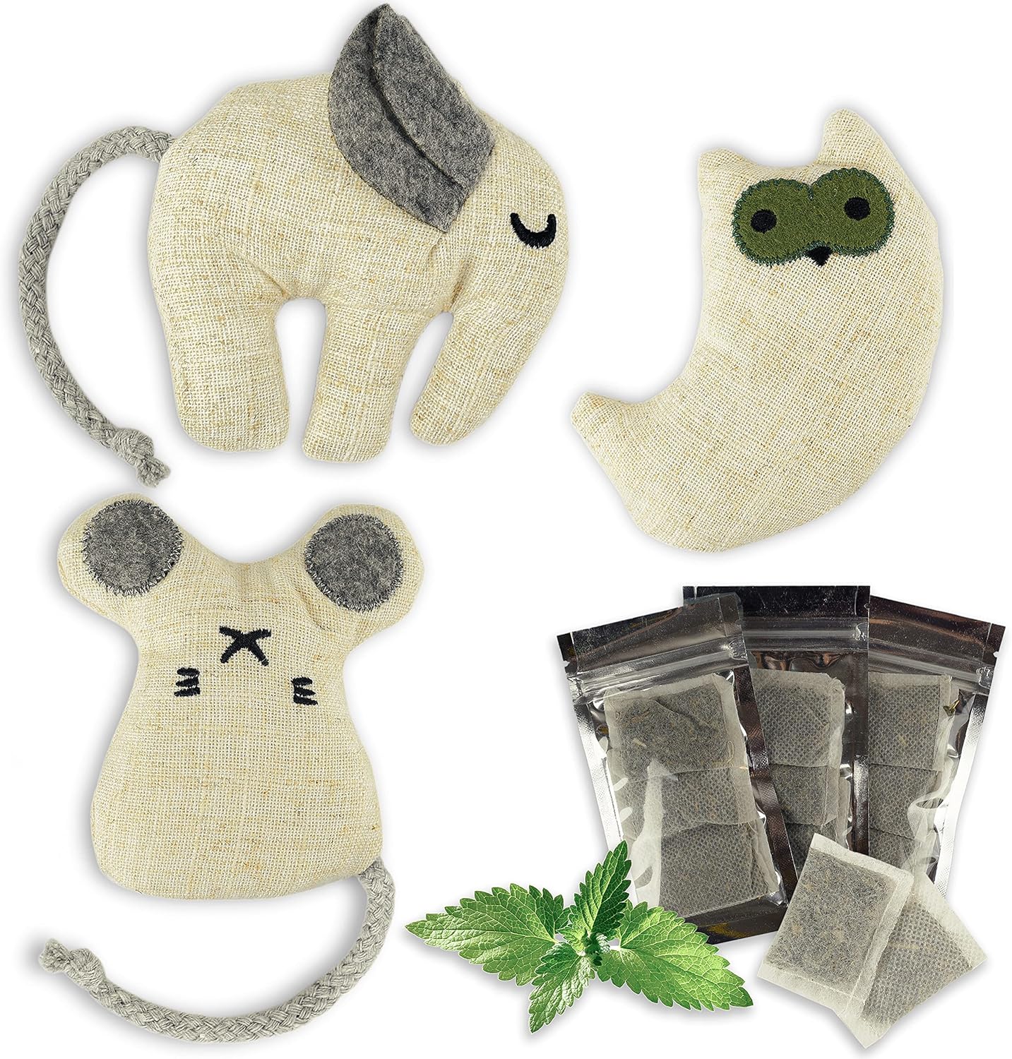 • ️ Пълен комплект – ще получите 3 различни играчки-животни (слон, бухал, мишка), както и 9 пакетчета котешка трева, които са херметически запечатани в комплект от по 3. Играчките-животни могат да се отварят със закопчалка, а торбичките с котешка трева могат да се сменят при необходимост.