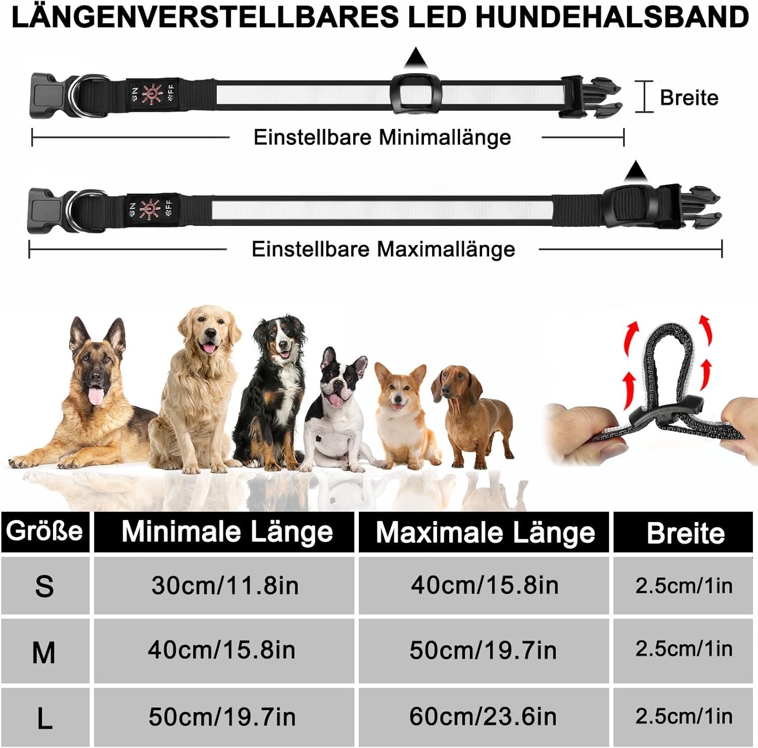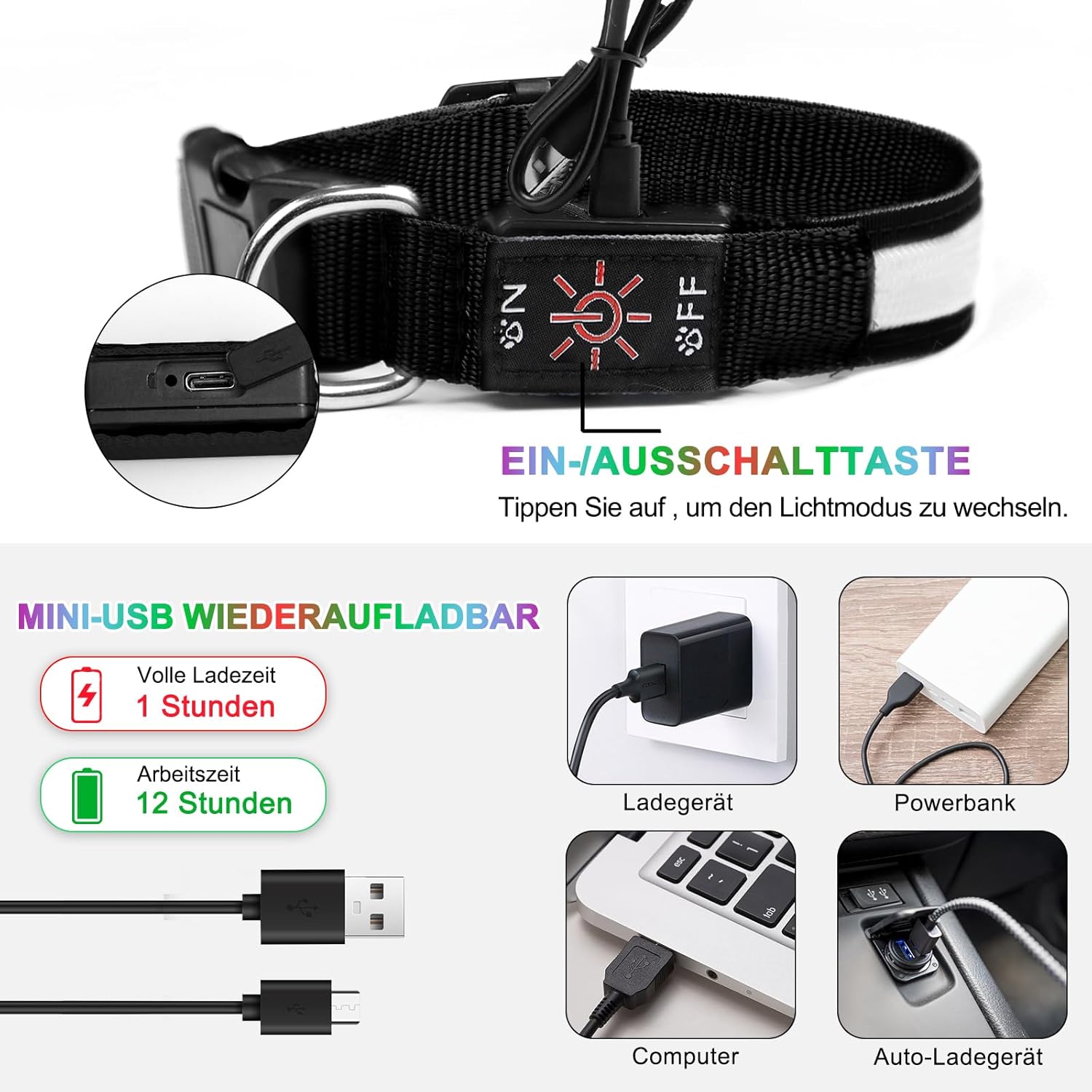 • Светлинен нашийник с висока видимост за кучета: нашите светлинни нашийници за кучета са оборудвани с по-ярък и привличащ вниманието светещ пръстен, така че можете веднага да видите точната позиция на вашия четириног приятел във всеки храст и трева. Специално за „тъмния сезон“, светлинният нашийник гарантира, че вие, минувачите, велосипедистите и автомобилистите можете да видите кучето си от голямо разстояние и по този начин да избегнете инциденти и изчезвания.