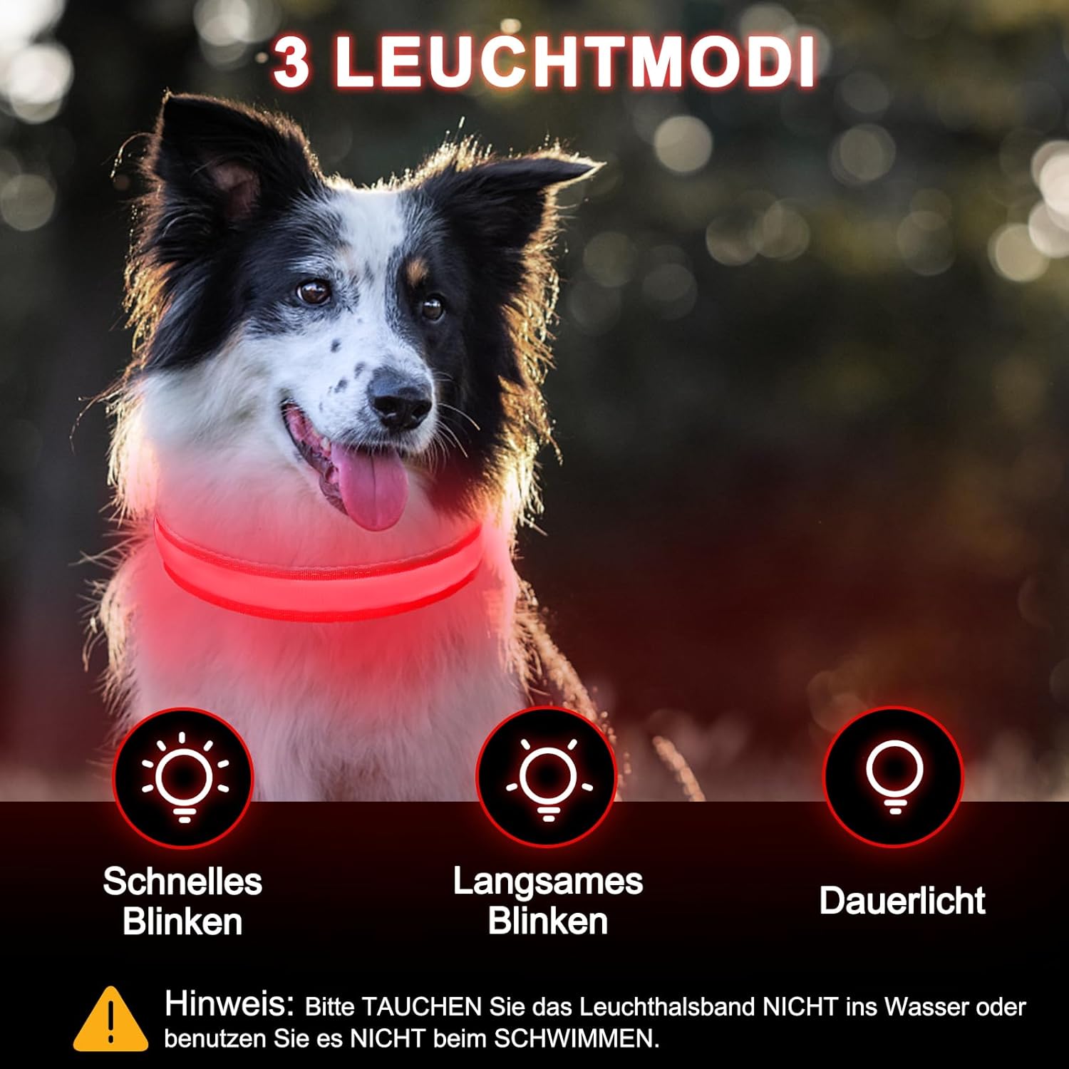 • Светлинен нашийник с висока видимост за кучета: нашите светлинни нашийници за кучета са оборудвани с по-ярък и привличащ вниманието светещ пръстен, така че можете веднага да видите точната позиция на вашия четириног приятел във всеки храст и трева. Специално за „тъмния сезон“, светлинният нашийник гарантира, че вие, минувачите, велосипедистите и автомобилистите можете да видите кучето си от голямо разстояние и по този начин да избегнете инциденти и изчезвания.
