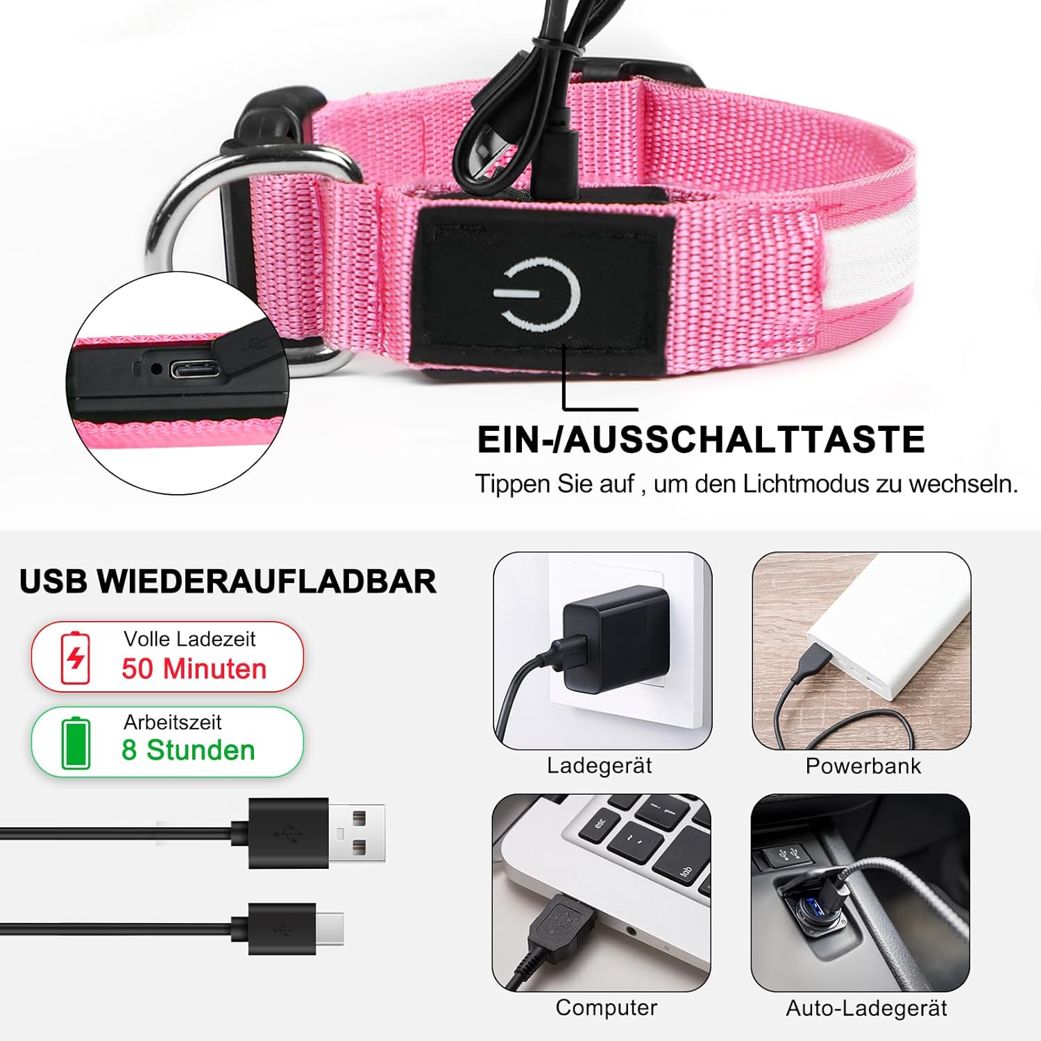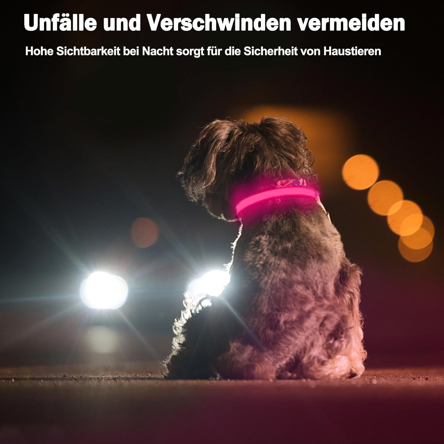 • Светлинен нашийник с висока видимост за кучета: нашите светлинни нашийници за кучета са оборудвани с по-ярък и привличащ вниманието светещ пръстен, така че можете веднага да видите точната позиция на вашия четириног приятел във всеки храст и трева. Специално за „тъмния сезон“, светлинният нашийник гарантира, че вие, минувачите, велосипедистите и автомобилистите можете да видите кучето си от голямо разстояние и по този начин да избегнете инциденти и изчезвания.