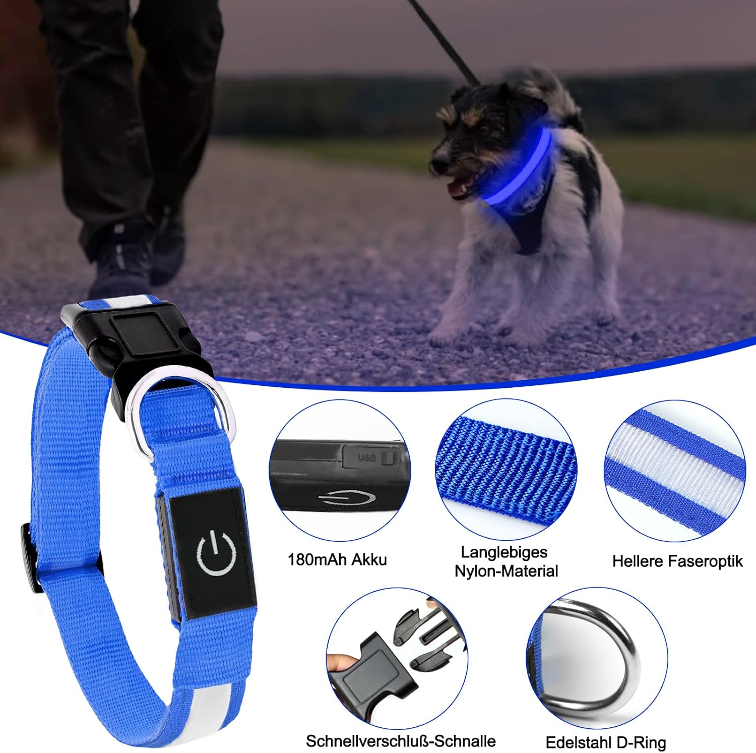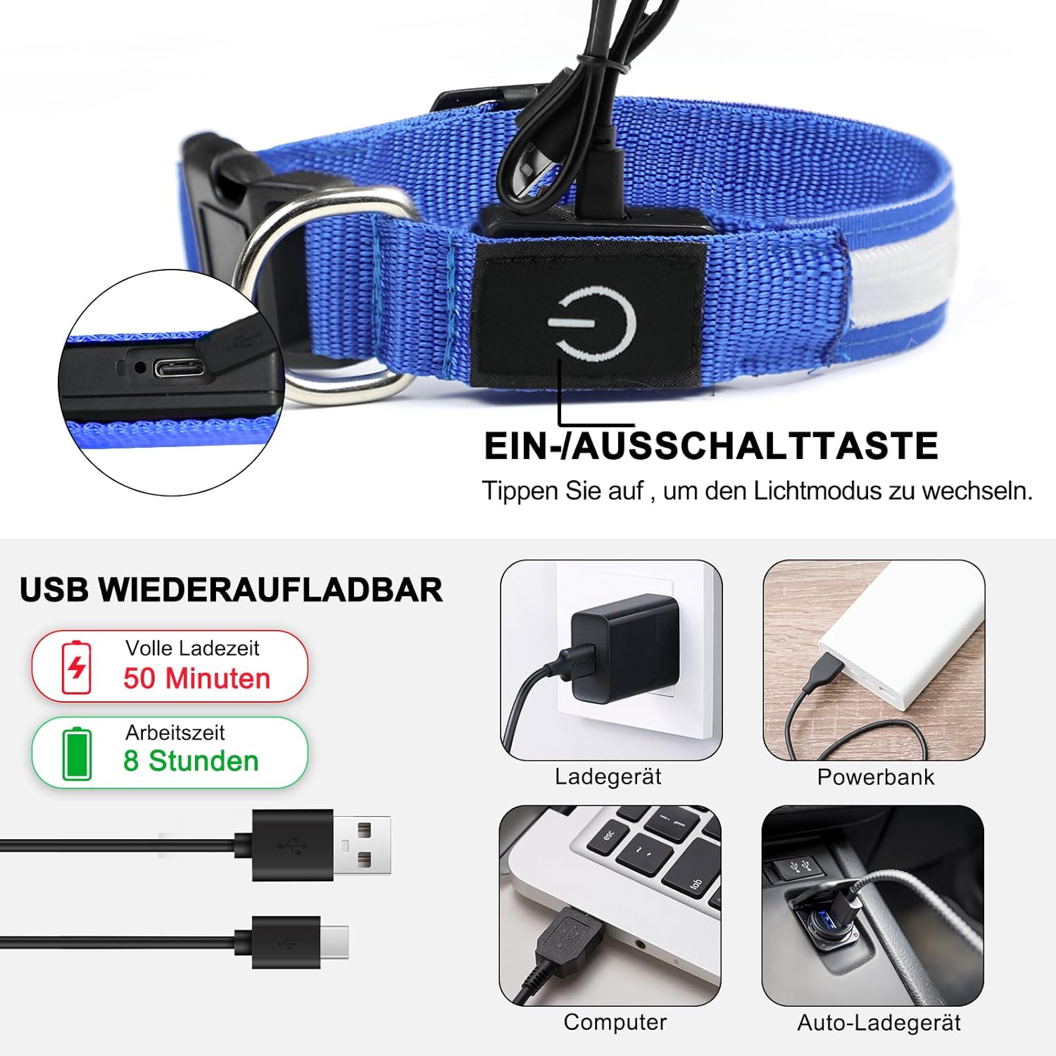 • Светлинен нашийник с висока видимост за кучета: нашите светлинни нашийници за кучета са оборудвани с по-ярък и привличащ вниманието светещ пръстен, така че можете веднага да видите точната позиция на вашия четириног приятел във всеки храст и трева. Специално за „тъмния сезон“, светлинният нашийник гарантира, че вие, минувачите, велосипедистите и автомобилистите можете да видите кучето си от голямо разстояние и по този начин да избегнете инциденти и изчезвания.