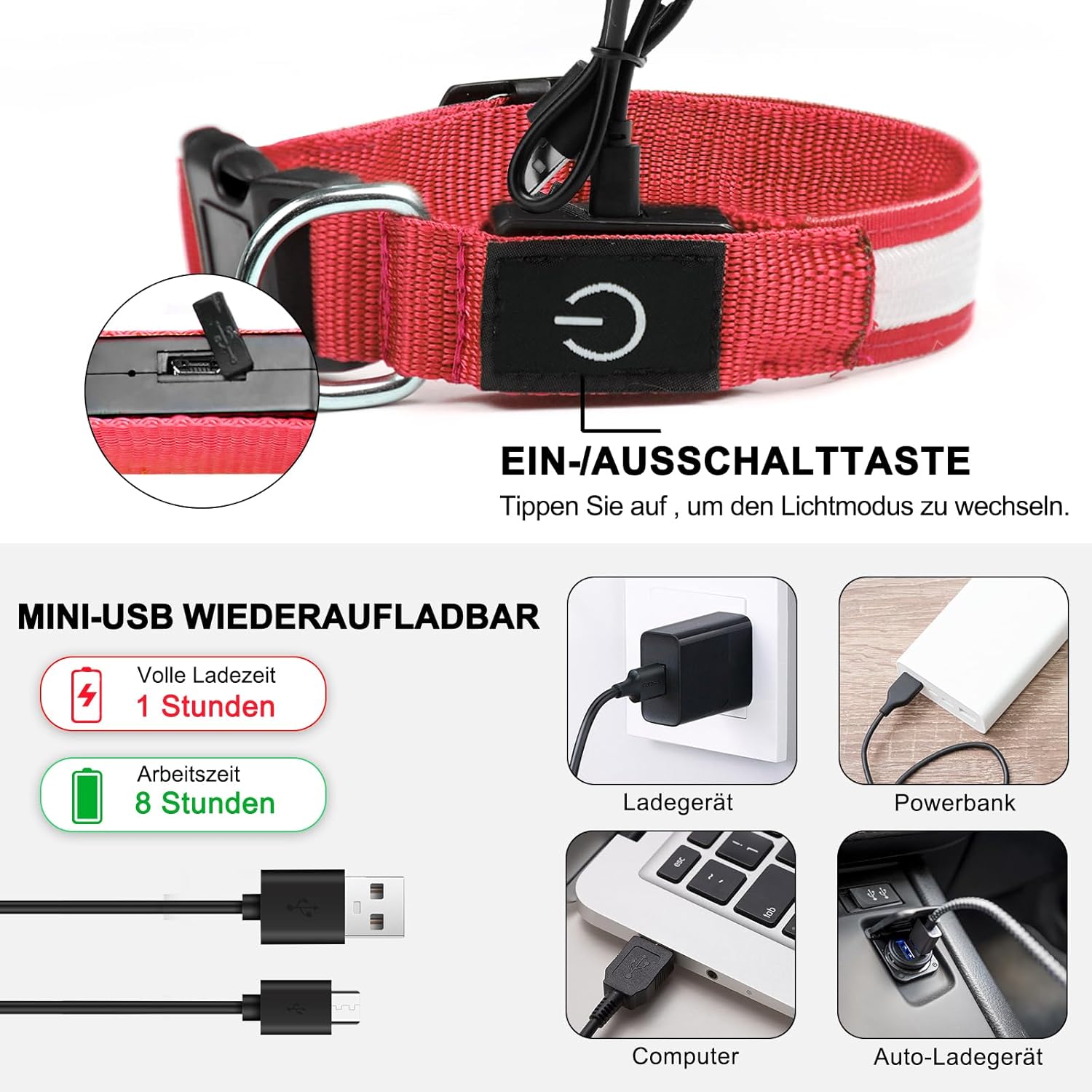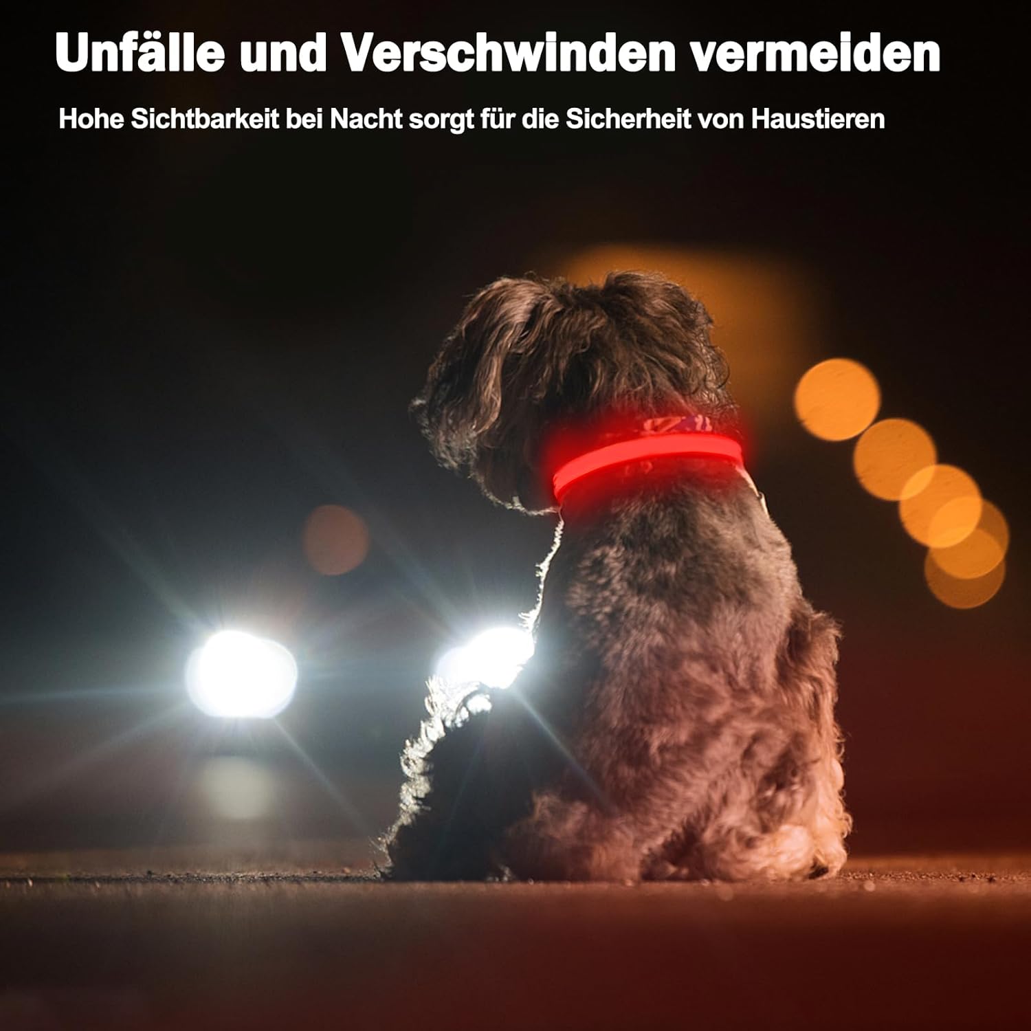 • Светлинен нашийник с висока видимост за кучета: нашите светлинни нашийници за кучета са оборудвани с по-ярък и привличащ вниманието светещ пръстен, така че можете веднага да видите точната позиция на вашия четириног приятел във всеки храст и трева. Специално за „тъмния сезон“, светлинният нашийник гарантира, че вие, минувачите, велосипедистите и автомобилистите можете да видите кучето си от голямо разстояние и по този начин да избегнете инциденти и изчезвания.