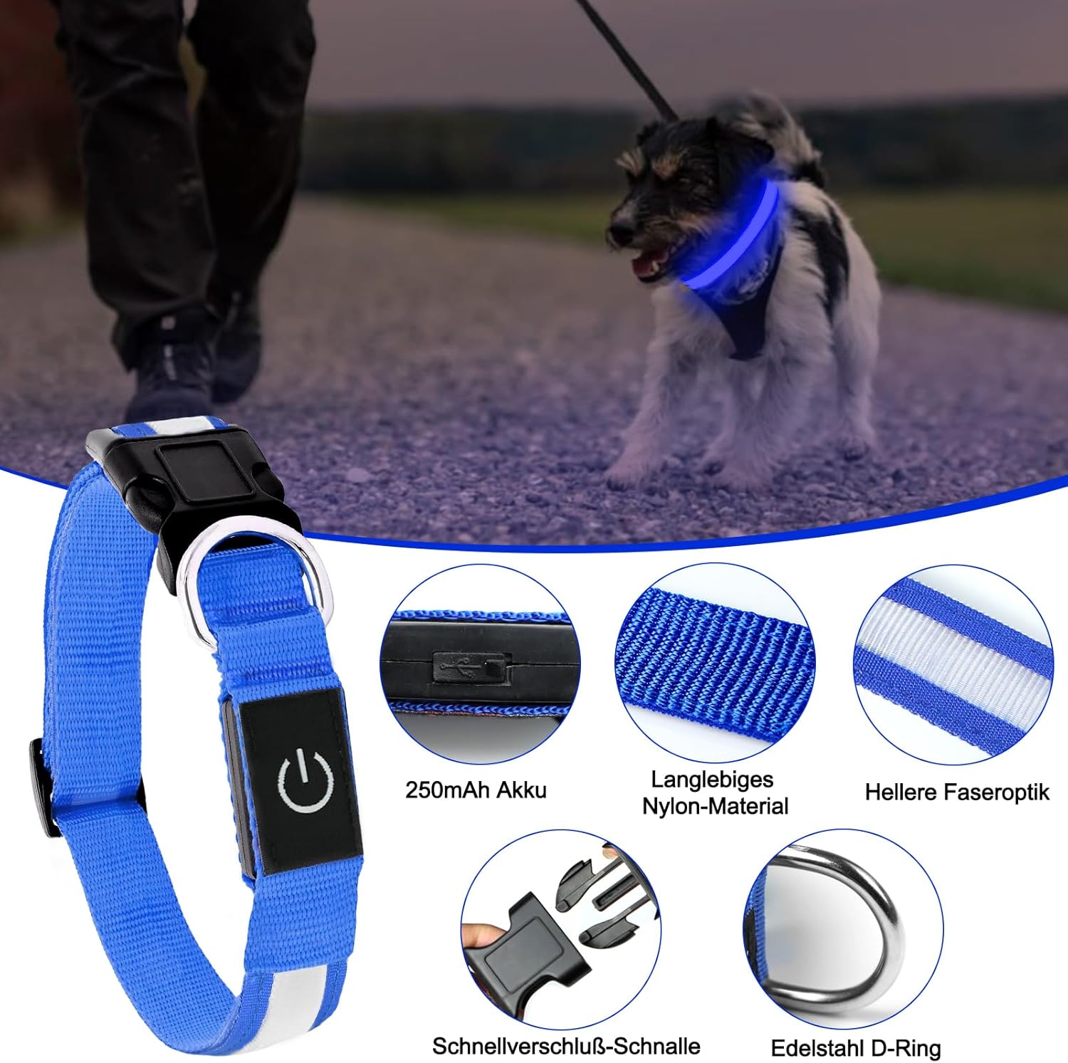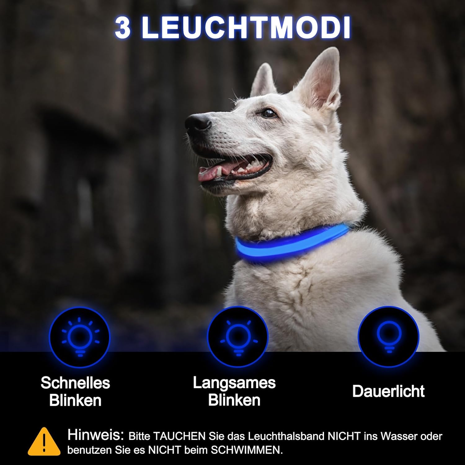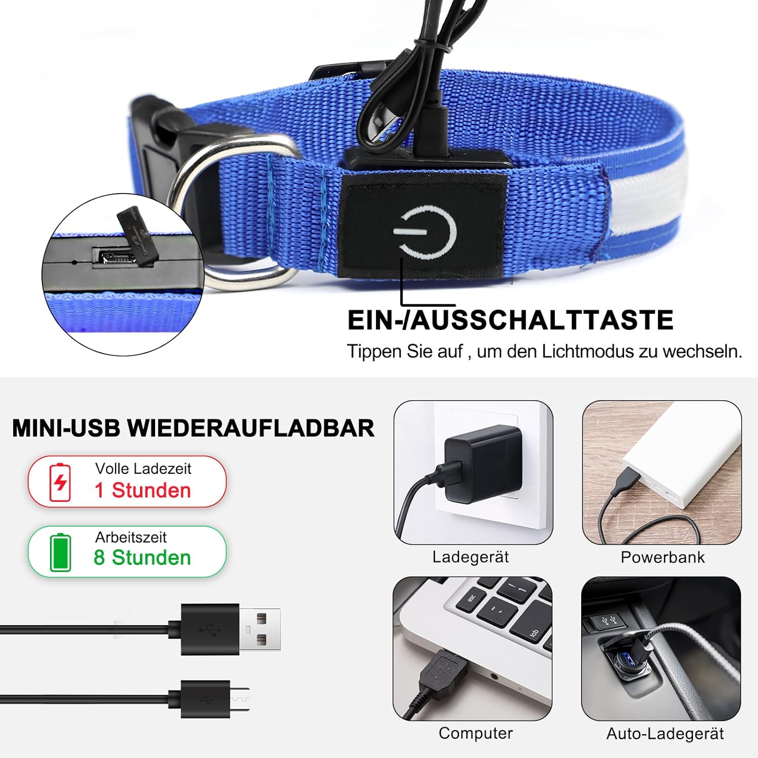 • Светлинен нашийник с висока видимост за кучета: нашите светлинни нашийници за кучета са оборудвани с по-ярък и привличащ вниманието светещ пръстен, така че можете веднага да видите точната позиция на вашия четириног приятел във всеки храст и трева. Специално за „тъмния сезон“, светлинният нашийник гарантира, че вие, минувачите, велосипедистите и автомобилистите можете да видите кучето си от голямо разстояние и по този начин да избегнете инциденти и изчезвания.
