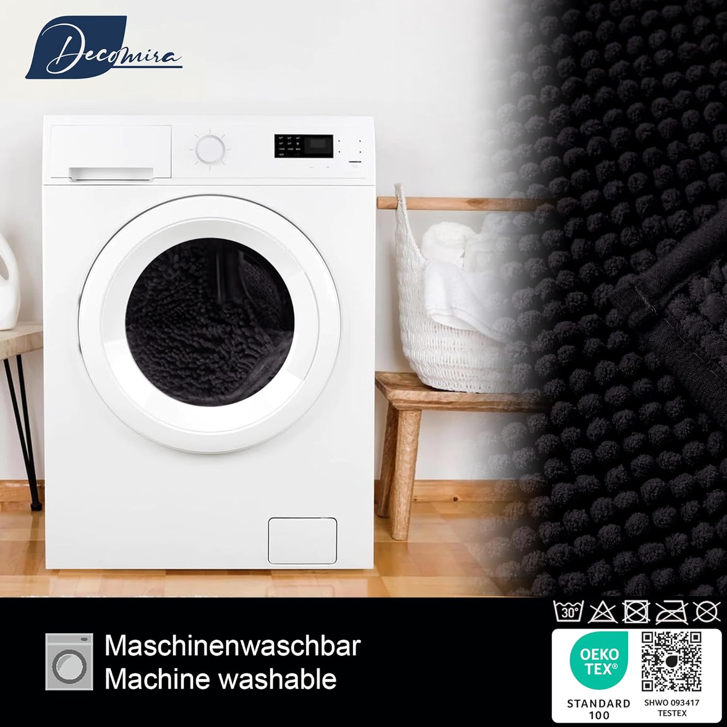 Постелките за баня Decomira са изработени от висококачествен и издръжлив материал. Плътният косъм и шевовете остават визуално и функционално непокътнати дори след многократно пране.