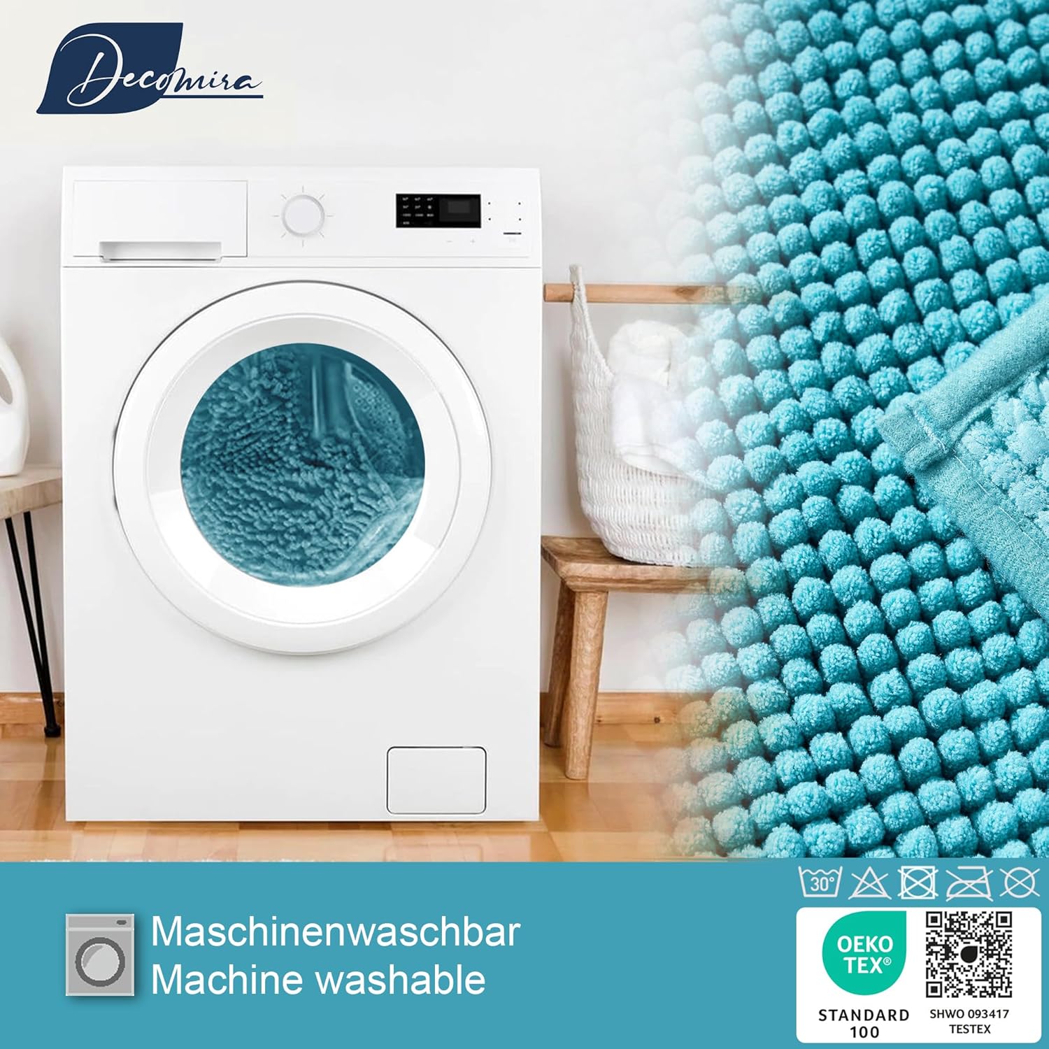 Килимчетата за баня Decomira са изработени от висококачествен шенил със сертификат Oeko-Tex 100 (SHWO 093417 TESTEX). Материалът е супер мек, абсорбиращ и щадящ кожата. Реактивният процес на боядисване осигурява устойчивост на цветовете на килимчетата за баня.