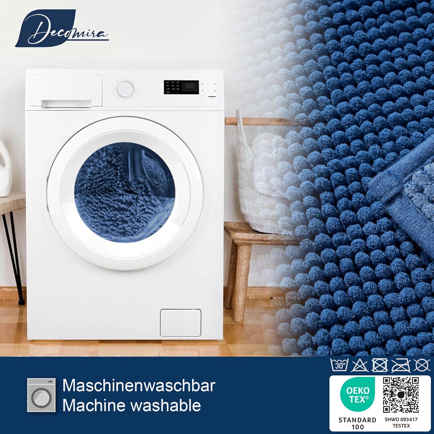 Постелките за баня Decomira могат да се перат в пералня на 30°C. Лесно се сгъват и не се свиват след пране.