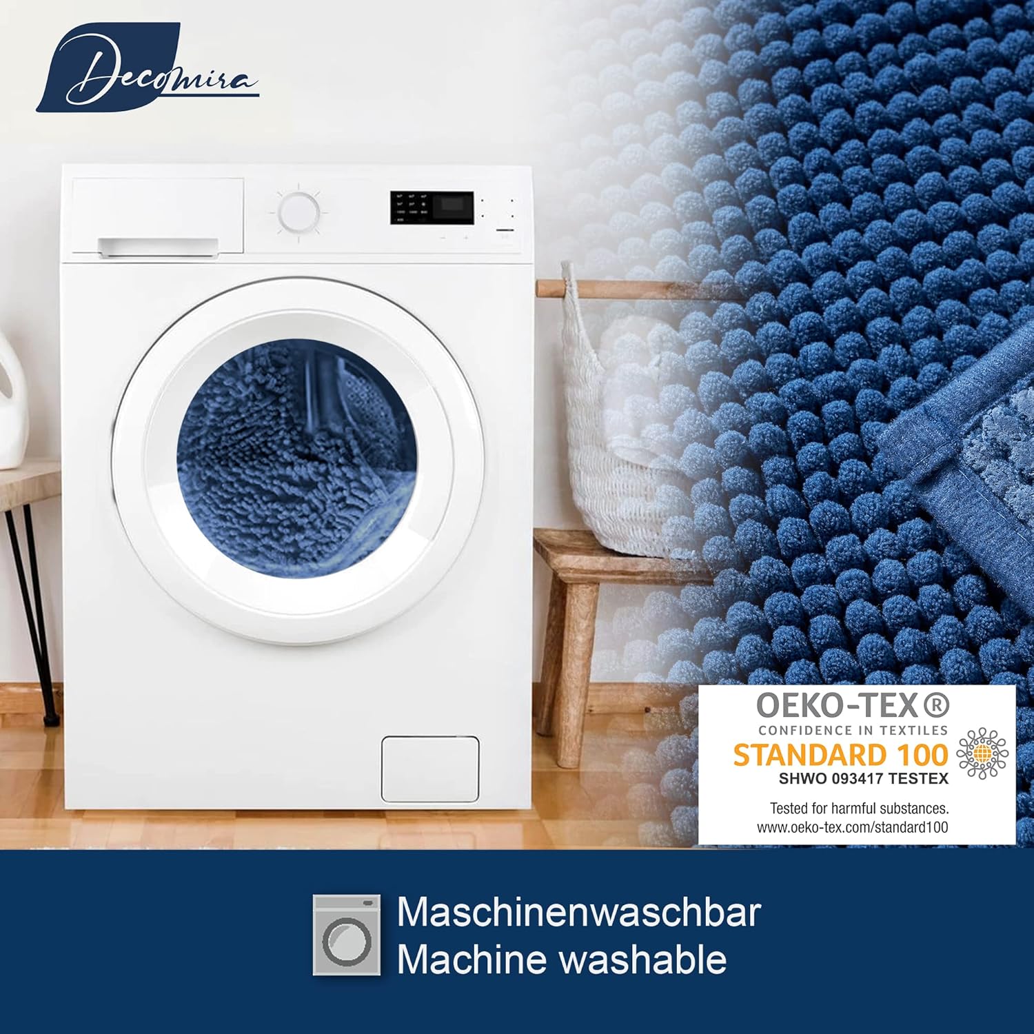 Постелките за баня Decomira са изработени от висококачествен и издръжлив материал. Плътният косъм и шевовете остават визуално и функционално непокътнати дори след многократно пране.